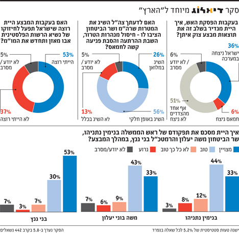 أظهر آخر استطلاع للرأي العام الإسرائيلي أن ما نسبته (36%) فقط من الإسرائيليين يعتقدون بأن "إسرائيل" انتصرت في الحرب فيما قال (51%) إن الحرب انتهت بالتعادل ودون إنتصار أي طرف. وجاء في الاستطلاع الذي أجراه مركز "حوار" لصالح صحيفة "هآرتس" العبرية أمس الثلاثاء وفي اليوم الأول من التهدئة أن (26%) فقط من الإسرائيليين يعتقدون أن أهداف الحرب التي أعلنها "بنيامين نتنياهو" ووزير جيشه "موشي يعلون" والمتمثلة بتصفية الأنفاق وإعادة الردع وضرب حماس، قد تحققت بالكامل. وعبر (56%) من الإسرائيليين عن اعتقادهم بأن هذه الأهداف تحققت بشكل جزئي، فيما عبر (13%) عن اعتقادهم بأنه لم يتحقق من هذه الأهداف أي شيء، وقال (5%) إنهم لا يعرفون. كما بين الاستطلاع أن (53%) من الإسرائيليين يؤيدون العمل حالياً على تقوية الرئيس الفلسطيني محمود عباس واستئناف المفاوضات فيما عبر (37%) عن عدم رغبتهم بذلك وأعرب (5%) عن عدم معرفتهم. ويرى مراقبون أن هذا الاستطلاع لن يكون دقيقا في هذه المرحلة، خاصة إذا أذعنت "إسرائيل" إلى مطالب المقاومة في المفاوضات الدائرة حالياً بالقاهرة، وستنخفض بشكل كبير نسبة الذي يعتقدون أن "إسرائيل" قد انتصرت.