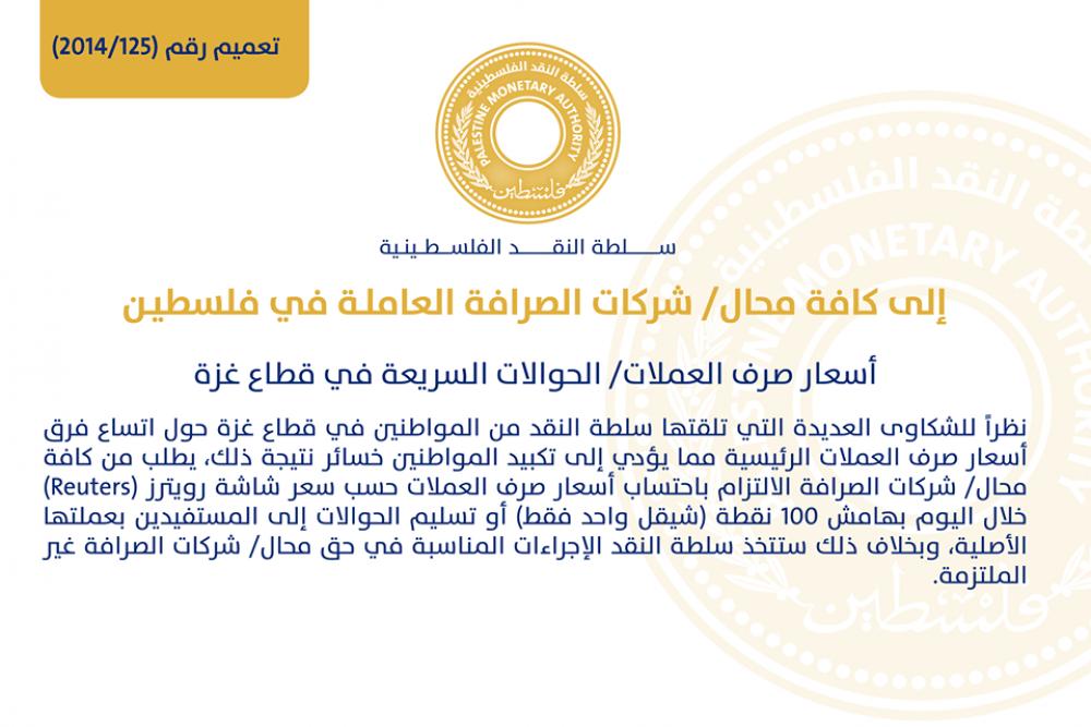 دعت سلطة النقد شركات الصرافة في قطاع غزة للالتزام باحتساب أسعار صرف العملات وفق سعر شاشة "رويترز" خلال اليوم بهامش 100 نقطة- أي شيكل واحد فقط. وطالبت السلطة في بيانٍ لها الثلاثاء أنه يتوجب على شركات الصرافة الالتزام بسعر شاشة "رويترز" أو تسليم الحوالات الواردة بعملتها الأصلية. وأشار البيان إلى أن المطالبة جاءت عقب الشكاوى التي تلقتها السلطة من المواطنين في القطاع والذي تسبب باتساع فرق أسعار صرف العملات وبالتالي تكبيد المواطنين خسائر نتيجة ذلك. وحذر البيان الشركات المخالفة باتخاذ الإجراءات المناسبة ضدها في حال عدم الالتزام بالقرارين. وشهدت أسعار صرف العملات في منتصف أيام الحرب على غزة بالمقارنة مع أسعار الصرف اليوم تباينًا كبيرًا فاق الـ10 شوقل لكل 100 دولار، على سبيل المثال.