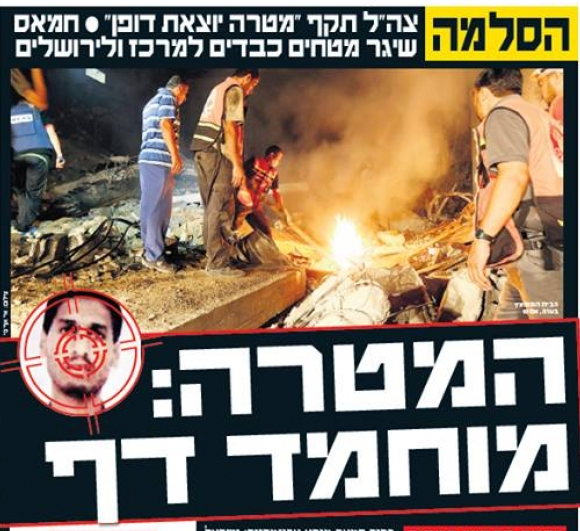 أعلن عضو المكتب السياسي لحركة حماس موسى أبو مرزوق عن استشهاد زوجة قائد كتائب الشهيد عز الدين القسام محمد الضيف وابنه علي الليلة، في القصف الإسرائيلي الذي استهدف منزل عائلة "الدلو" في مدينة غزة. وقال أبو مرزوق على حسابه في "الفيسبوك": "إن حماقة نتنياهو أضافت لسجله جريمة جديدة في استهداف المدنيين، وانتهاك العهود والاتفاقيات، والخيبة الاستخبارية الجديدة.. وأخيرا التأكيد على أنه لا يعرف للصديق مكانا". وأكد أن مزاعم الاحتلال عن سقوط ثلاثة صواريخ في وقت سابق من اليوم لم تكن سوى ذريعة لإفشال مفاوضات القاهرة التي كانت ترمي إلى وقف إطلاق النار. وأوضح قائلاً: "في خطوة غير متوقعة (إسرائيل) تعلن سقوط ثلاثة صواريخ عليها.. نتنياهو يعلن: وقف التفاوض، وسحب الوفد، وإنهاء التهدئة، وسط حيرة الجميع.. ﻻ ندري لهذه الخطوات من سبب، ولم نلبث طويلاً حتى جاءت الأخبار، ليس هناك من صواريخ انطلقت من قطاع غزة". وأضاف "لكنها ذريعة لاستهداف شخصية كبيرة من حماس، فتم سحب الوفد، وإلغاء التهدئة، وكانت الجريمة الجديدة في بيت ال الدلو واستشهدت فيها زوجة القائد الكبير أبو خالد محمد الضيف وابنه، رحمهما الله رحمة واسعة وانا لله وانا اليه راجعون". ونشرت صحيفة "يديعوت أحرنوت" العبرية على صدر صفحتها التي ستصدر اليوم الأربعاء عنواناً بارزاً قالت فيه: " "الهدف - محمد ضيف". وكانت كتائب الشهيد عز الدين القسام تحدت الاحتلال أن يعلن عن السبب الحقيقي الكامن وراء العمل الجبان في قصفه لمنزل عائلة الدلو. وتوعدته قائلةً: "العدو بخرقه للتهدئة فتح على نفسه أبواب الجحيم". واستشهد ثلاثة مواطنين من عائلة الدلو بينهم سيدة وطفل وأصيب العشرات جراء سلسلة غارات إسرائيلية على قطاع غزة استهدفت إحداها منزل سكني في خرق إسرائيلي لتفاهمات التهدئة المؤقتة التي دعت إليها مصر الليلة الماضية لمدة 24 ساعة.