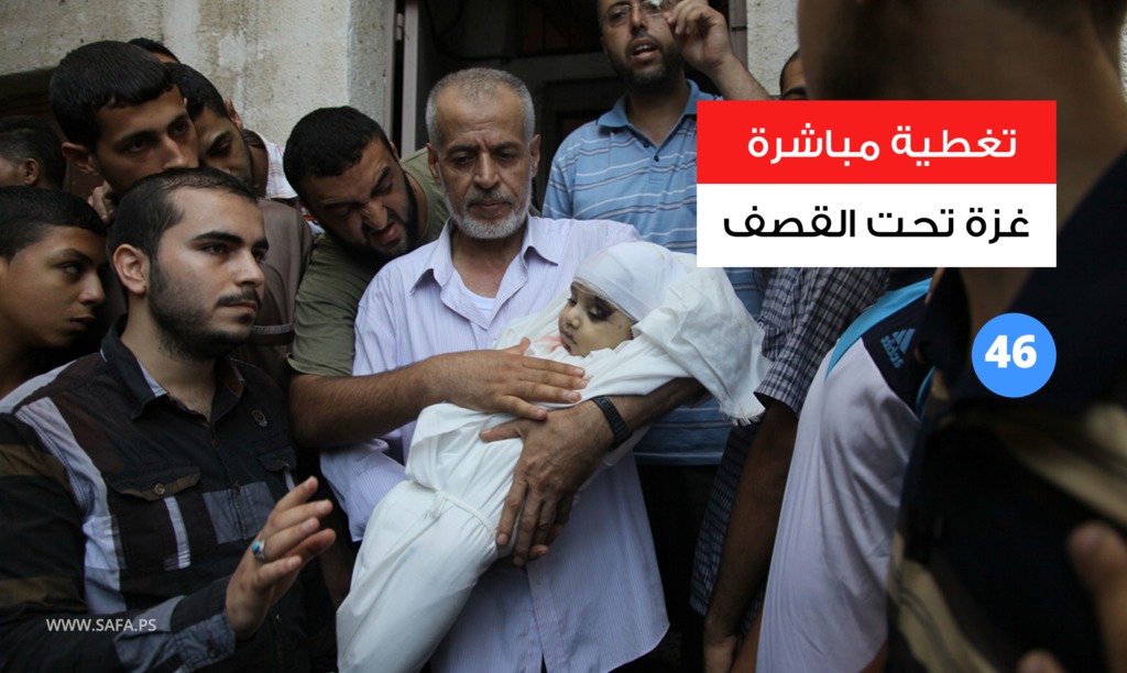 يواصل جيش الاحتلال الإسرائيلي منذ مساء الثلاثاء 19 أغسطس عدوانه على قطاع غزة قبل انتهاء فترة التهدئة التي كانت مقررة منتصف ليل الاثنين-الثلاثاء، وقصف عشرات المواقع. وبلغت حصيلة العدوان الإسرائيلي على قطاع غزة لليوم 46 نحو 2078 شهيدًا وأكثر من و10345 جرحى. وفيما يلي رصد للعدوان الإسرائيلي على القطاع لحظة بلحظة: [color=red]12:05[/color] مراسلنا: زوارق الاحتلال تطلق نيران رشاشاتها في عرض بحر رفح جنوب قطاع غزة [color=red]12:00[/color] مراسلنا: طائرات الاحتلال تدمر منزلًا لعائلة شملخ بمنطقة الشيخ عجلين جنوب غرب مدينة غزة [color=red]11:50[/color] مراسلنا: استهداف أرض زراعية بجحر الديك جنوب شرق مدينة غزة [color=red]11:10[/color] مراسلنا: شهيدا قصف منزل بحي المشاعلة بدير البلح هما بشير ومحمود شريتح إضافة إلى 4 جرحى [color=red]11:00[/color] شهيدان وإصابات بقصف منزل لعائلة شريتح بدير البلح وسط قطاع غزة [color=red]10:00[/color] مراسلنا: قصف مدفعي متقطع شرق حي التفاح شرق مدينة غزة [color=red]9:40[/color] مراسلنا: استهداف أرض زراعية غرب ثكنة سعد صايل شرق رفح جنوب قطاع غزة [color=red]9:30[/color] مراسلنا: طائرات الاحتلال تقصف مقبرة الشيخ رضوان غرب مدينة غزة [color=red]9:20[/color] مراسلنا: استهداف أرض زراعية جنوب حي الزيتون جنوب شرق مدينة غزة [color=red]9:00[/color] مراسلنا: استشهاد عبد الرحمن أبو شلوف (31 عامًا) بقصف إسرائيلي شرق رفح جنوب قطاع غزة [color=red]9:15[/color] مراسلنا: لا إصابات باستهداف سيارة قرب مقبرة الشيخ رضوان غرب مدينة غزة [color=red]8:30[/color] مراسلنا: تدمير منزل لعائلة الحميدي على طريق كيسوفيم بقرية وادي السلقا شرق دير البلح وسط قطاع غزة [color=red]8:20[/color] استشهاد إبراهيم راشد بركة متأثرًا بجراح أُصيب بها في وقت سابق في دير البلح وسط قطاع غزة [color=red]7:30[/color] الصحة: حصيلة العدوان الإسرائيلي المستمر لليوم 46 بلغ 2078 شهيد و10345 جريح، وحصيلة الشهداء اليوم 29 شهيدًا وأكثر من 105 جريحًا [color=red]7:05[/color] مراسلنا: إصابة باستهداف منزل لعائلة أبو جبل بحي الأمل بخانيونس جنوب قطاع غزة [color=red]6:55[/color] مراسلنا: استشهاد الطفلة صبا رامي يونس (4 سنوات) متأثرة بجراحها بعد قصف الاحتلال منزلها في حي تل السلطان برفح في غارة منزل كلاب فجرًا [color=red]6:50[/color] مراسلنا: شهيدا استهداف الدراجة النارية برفح جنوب القطاع هما مروان أبو شلوف وإبراهيم حماد [color=red]6:42[/color] مراسلنا: شهيدان باستهداف دراجة نارية في كراج رفح الشرقي وسط مدينة رفح [color=red]6:40[/color] مراسلنا: إصابة باستهداف جديد بحي الأمل غرب خانيوس جنوب قطاع غزة واستهداف آخر قرب حاووز مياه عائلة القرا ببني سهيلا شرق خانيونس [color=red]6:21[/color] مراسلنا: استهداف قرب مسجد البلد بدير البلح وسط قطاع غزة ولا إصابات [color=red]6:20[/color] مراسلنا: استهداف أرض زراعية قرب سوق حي الأمل غرب خانيونس جنوب قطاع غزة [color=red]5:40[/color] مراسلنا: إصابتان بقصف أرض زراعية بجانب منزل لعائلة رضوان بمنطقة السودانية شمال غرب غزة [color=red]5:20[/color] الصحة: وصول 4 إصابات بجراح مختلفة إلي مستشفي شهداء الأقصي من استهدافات متفرقة وسط القطاع [color=red]4:50:[/color] مراسلنا: الطيران الحربي يقصف أرضا زراعية شرق بلدة جباليا شمال القطاع [color=red]4:42: [/color]طائرات ومدفعية الاحتلال تقصف عدة أهداف في بلدة بيت لاهيا شمال القطاع [color=red]4:35: [/color]مراسلنا: طائرات الاحتلال تقصف أرضا زراعية على شارع أحمد ياسين بمنطقة الصفطاوي شمال غزة [color=red]3:49:[/color] إصابات بقصف طائرة حربية بدون طيار مجموعة مواطنين في شارع البيئة بمدينة دير البلح وسط القطاع [color=red]3:21:[/color] مدفعية الاحتلال تقصف محيط مصنع شومر وسط القطاع والزوارق تقصف موقعي بدر والمشتل غرب غزة [color=red]3:05: [/color]القدرة: التعرف على شهداء قصف سيارة مدنية بحي النصر وهم: محمد أحمد عباس 45 عاما وعصام محمد الحسنى 26 عاما [color=red]2:54: [/color]مراسلنا: تجدد القصف المدفعي على أراض زراعية شرق غزة [color=red]2:34: [/color]مراسلونا: الاحتلال يكثف غاراته على المناطق الشرقية بقطاع غزة [color=red]2:29: [/color] الصحة: حصيلة الشهداء منذ صباح اليوم 26شهيدا، والحصيلة الكلية منذ بدء ال