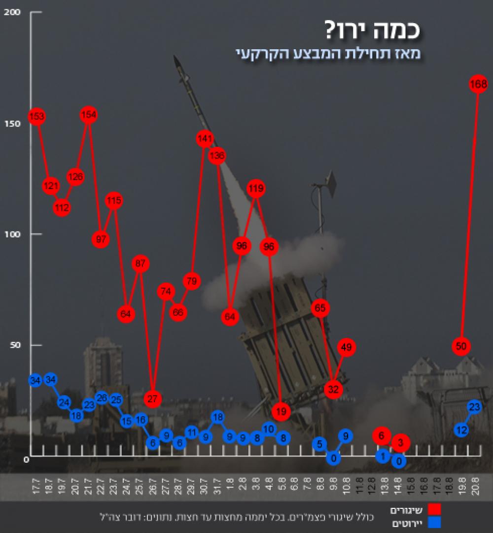 قالت تقارير إسرائيلية إن المقاومة الفلسطينية سجلت رقمًا قياسيًا جديدًا منذ بدء القتال في عدد الصواريخ وقذائف الهاون التي أطلقت من قطاع غزة باتجاه المواقع العسكرية والمدن الإسرائيلية خلال 24 ساعة. وبحسب هذه التقارير فإنه تم إطلاق 168 صاروخا وقذيفة هاون طيلة يوم أمس الأربعاء، أي بعد يوم من محاولة اغتيال القائد العام لكتائب القسام محمد الضيف في منزل يعود لعائلة الدلو غرب غزة. وأفادت أنه لم ترد أنباء عن وقوع إصابات في صفوف الإسرائيليين، وإنما عن أضرار مادية. كما زعمت اعتراض 23 صاروخا منها بواسطة "القبة الحديدية". وكانت كتائب القسام هددت أمس باستهداف مطار بن غوريون في اللد في الساعة السادسة من صباح اليوم، ودعت شركات الطيران الدولية إلى إلغاء رحلاتها الجوية إلى المطار. وأكدت التقارير الإسرائيلية أن المقاومة في قطاع غزة واصلت طوال أمس إطلاق الصواريخ والقذائف باتجاه المستوطنات المحيطة بقطاع غزة، ومدن الجنوب والمركز.