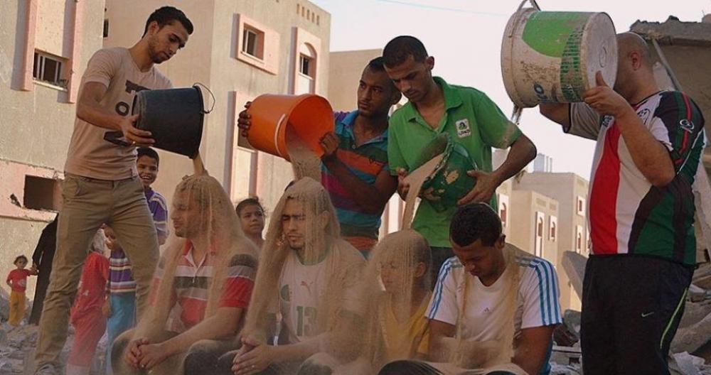 شارك مجموعة من الصحفيين الرياضيين في مدينة رفح جنوب قطاع غزة بفعالية تظهرهم وهم يقومون بسكب دلو من التراب في رسالة إلى العالم حول ما يشعر به أطفال غزة والمدنيين حينما يتم قصفهم من الطائرات الحربية الإسرائيلية وتدمير المنازل فوق رؤوسهم على غرار ما يقوم به لاعبو العالم بالماء البارد. وشارك في الفعالية الصحفيين مصطفي جبر، ومحمد، ويوسف الغريب، وسرحان أبو السعيد، وعلاء سلامة، ولاعب نادي شباب رفح يحيى الرخاوي، واستوحى المتضامنين هذه الفكرة من تحدي سكب الماء "دلو الثلج"، حيث يتم سكب دلو من الماء والثلج البارد جداً على رأس الشخص، وهذا جزء من حملة تحدي لنشر التوعية حول مرض التصلب الجانبي الضموري أو الـ "ASL" وجمع التبرعات. ولكن في رفح سكبوا على رؤوسهم بقايا حطام وركام من البيوت المدمرة في تحدي للعالم الذي لا يولي الحرب على غزة أي اهتمام، حيث تواصلت الحرب لليوم 51 على التوالي واستشهد فيها أكثر من 2120 مواطناً وأصيب ما يقارب من 11 ألف أخرين، وهدمت آلاف البيوت، والمساجد، والمدارس على رؤوس المواطنين الأبرياء. وقال الإعلامي محمد الغريب: "هنا غزة فلسطين التي يقتل أطفالها ونسائها بسقوط أطنان القنابل، ومن أمام منزل عائلة زعرب الذي استشهد فيه 23 مواطناً برئ معظمهم أطفال ونساء على العالم أن يشعر بما يشعر به المظلومين، وأن يأخذ كل فرد دلو من التراب ويسكبه على رأسه". بدوره، أكد جبر أن هذه رسالة إلى العالم أجمع أن هذا التراب يسقط يومياً فوق رؤوس الأطفال والأبرياء بسبب قصف الطائرات الإسرائيلية لأطنان القنابل فوق رؤوسهم ورسالتنا لجميع اللاعبين والرياضيين في الدول العربية والعالم أن يفكروا في أطفال غزة ويدعموهم بلفتة هامة عبر هذه الطريقة. يشار إلى أن منازل الكثير من الرياضيين تعرضت للتدمير خلال الحرب على غزة، كما استشهد وأصيب عشرات أخرين منهم.