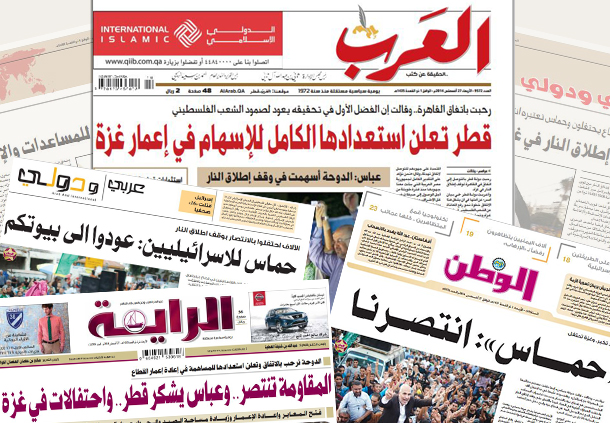 رحبت دولة قطر بالتوصل إلى اتفاق وقف إطلاق النار في قطاع غزة، معربة عن أملها في أن يشكل هذا الاتفاق خطوة نحو رفع المعاناة عن الشعب الفلسطيني في القطاع وتحقيق مطالب الشعب الفلسطيني العادلة. وذكرت قطر في بيان صحفي أن الفضل الأول في تحقيق هذا الاتفاق يعود لصمود الشعب الفلسطيني وتضحياته العزيزة، معربة عن تقديرها لكل من ساهم في التوصل إلى هذا الاتفاق وعن استعدادها الكامل للمساهمة في إعادة إعمار قطاع غزة بأسرع وقت ممكن. وأعلنت حركة "حماس" مساء الثلاثاء انتصار المقاومة الفلسطينية وقطاع غزة على الاحتلال الإسرائيلي مع الإعلان عن اتفاق لوقف إطلاق النار بعد عدوان استمر 50 يوما. وعمت حالة من الفرحة غير المسبوقة في أرجاء مدينة غزة، عقب إعلان المقاومة الفلسطينية عن الانتصار في معركة "العصف المأكول" ووقف إطلاق النار مساء الثلاثاء، وخرج الآلاف من المواطنين إلى شوارع المدينة للإعراب عن سعادتهم، في حين كانت مآذن المساجد تكبر وتهلل فرحا بهذا الانتصار. واحتفلت معظم الصحف القطرية بانتصار غزة، حيث زينت صفحاتها الأولى بصور فرحة الفلسطينيين وعناوين تمجد الفلسطينيين ومقاومتهم في غزة.