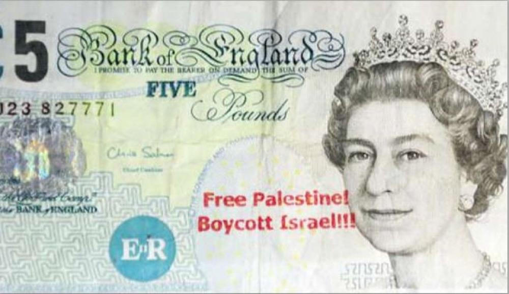 دشن ناشطون ببريطانيا حملة أخذت على عاتقها مهمة طباعة شعار مساند لفلسطين ومناهض للكيان الإسرائيلي على عملات ورقية من فئة 5 جنيه استرليني. وذكرت صحيفة "ديلي ميل" البريطانية أن شعار الحملة التي بدأت مؤخراً نصت على: "حرروا فلسطين وقاطعوا إسرائيل"، وطبعت باللون الأحمر. وأضافت الصحيفة أن العملات الورقية الجديدة انتشرت بشكل ملحوظ في مدينتي بولتون ومانشستر. وأشارت إلى تصريحات بنك انجلترا (البنك المركزي بالمملكة المتحدة)، الذي وصف التصرف بأنه مخالف للقانون، باعتباره تشويهًا لعملات وطنية، مؤكدًا أن الأمر قد يصل إلى حد توجيه الاتهام الرسمي لأصحاب الحملة ومقاضاتهم. ولفتت إلى ما جاء على لسان أصحاب أحد المحلات التجارية التي تروج للعملات التي تحمل الشعار، حيث قال:" الأمر ببساطة يرجع إلى الأحداث الجارية التي دفعت أعضاء الحملة إلى هذا الحل لأجل رفع الوعي بالقضية الفلسطينية، وتحديد الطرف الذي ينبغي مساندته". وأضاف "ما تفعله إسرائيل هو الخطأ بعينه، ولابد من مقاطعتها وتأييد فلسطين، والطباعة على العملات الورقية ليست إلا وسيلة لرفع الوعي ونشر الرسالة السياسية التي تحملها بين المواطنين".