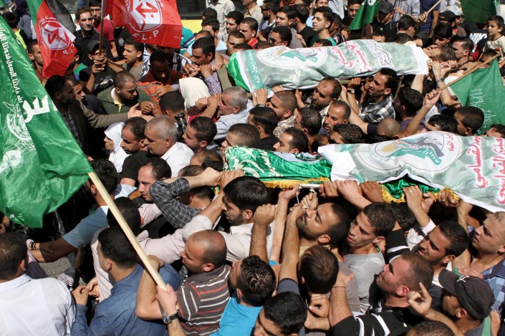 شيعت جماهير غفيرة بعد ظهر الثلاثاء جثماني الشهيدين القساميين عامر أبو عيشة ومروان القواسمة في مسقط رأسيهما بمدينة الخليل جنوب الضفة الغربية المحتلة. وانطلقت مسيرة التشييع من مسجد الحسين بن علي في المدينة، وجابت شوارعها وصولًا إلى مقبرة الشهداء في حارة الشيخ، حيث ووري جثماني الشهيدين الثرى. ورفع المشاركون رايات حماس ورايات عدد من الفصائل الوطنية والإسلامية، وهتفوا بالشعارات المنددة بجريمة اغتيال المقاومين، والمطالبة بالرد الفوري على الجرائم المتواصلة. وأشاد المشاركون ببطولات الشهيدين، وبعملية الأسر التي وصفوها بالبطولية، إضافة إلى التمجيد بالاشتباك المسلح مع قوات الاحتلال المدججة بالأسلحة. وأكد متحدث باسم حماس في المسيرة أن دماء الشهداء لن تذهب هدرا، وأن الاحتلال سيدفع ثمنا باهظا مقابل الجريمة التي ارتكبها الاحتلال، مضيفًا أن "الخليل ولودة بالمقاومين رغم الحملات المستمرة، والجرائم التي يواصلها الاحتلال". وفي أعقاب مسيرة التشييع اندلعت مواجهات عنيفة بين المواطنين وقوات الاحتلال في منطقة باب الزاوية، أطلق الاحتلال خلالها قنابله الغازية والصوتية ورصاصه المطاطي ما أوقع عدة حالات اختناق في صفوف الشبان. وكانت كتائب الشهيد عز الدين القسام الجناح العسكري لحركة حماس زفت لأبناء شعبنا الفلسطيني شهيديها المطاردين القواسمي وأبو عيشة، اللذين ارتقيا برصاص الاحتلال في مدينة الخليل جنوب الضفة الغربية المحتلة بعد نحو ثلاثة أشهر من تنفيذهما عملية أسر ثلاثة مستوطنين وقتلهم بالمدينة.