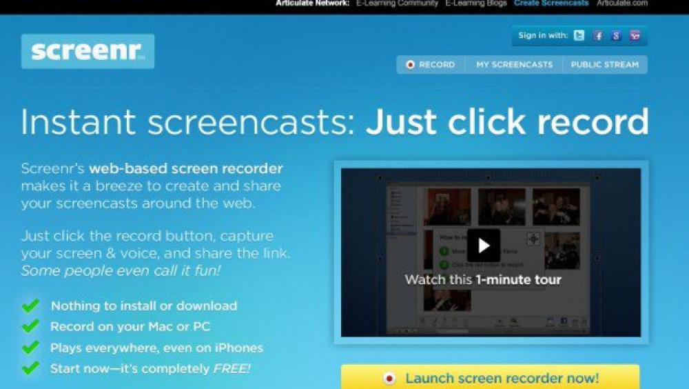 يحتاج العديد من مستخدمي أجهزة الكمبيوتر إلى برامج تتيح لهم إمكانية تسجيل الشاشة الخاصة بهم، مما يسمح لهم بتقديم شروحات فيديو لأمر مهم يقومون بمعمله، أو ربما تسجيل فيديو لمشكلة تحصل على الكمبيوتر. ولكن موقع screenr.com يتيح إمكانية تسجيل مقطع فيديو لشاشة الكمبيوتر دون الحاجة لتثبيت أي برامج، ومن ثم نشره على يوتيوب، وكل ما على المستخدم هو القيام بفتح الموقع ومن ثم الضغط على زر Record. بعد ذلك ستفتح صفحة جديد للمستخدم تتأكد من وجود جافا على الجهاز، وفي حال عدم وجود برمجية جافا ستطلب الصفحة تثبيت البرمجية ليعمل الموقع، مع العلم أن الموقع يتيح تسجيل فيديو لمدة 5 دقائق، شرط أن تبقى الصفحة مفتوحة طيلة عملية التسجيل.