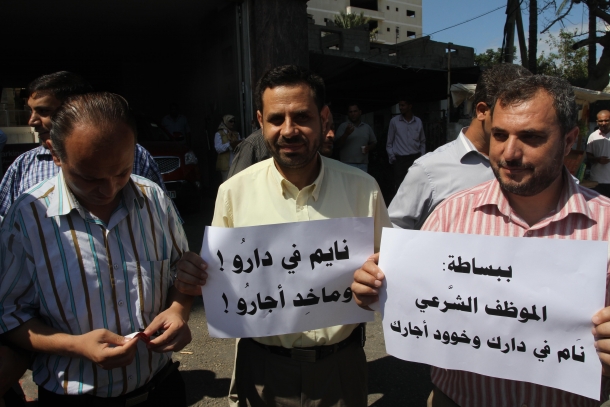 أعلنت نقابة الموظفين في قطاع غزة عن سلسلة فعاليات احتجاجية لعدم حل مشكلة الموظفين بدمجهم وصرف رواتبهم، مؤكدة أن حكومة التوافق لم تقدم لهم إلا الوعود الجوفاء والتصريحات الغامضة. وقالت النقابة في بيان صحفي تلقت "صفا" نسخة عنه إنه سيتم تعليق العمل واعتصام يومي الأربعاء و الخميس الموافق 15-16 أكتوبر بدءاً من الساعة 12 وحتى الساعة 2 ظهرا في كافة الوزارات والهيئات والسلطات، وفي المدارس بعد الحصة الثالثة. وذكرت أنه سيجري تنظيم اعتصام أمام مجلس الوزراء يوم الثلاثاء الموافق 21 أكتوبر الساعة 11 صباحا، يليه في اليوم التالي الأربعاء إضراب شامل في كافة الوزارات والهيئات والسلطات. وطالبت كافة الموظفين بالمشاركة الفاعلة بفعاليات النقابة وجميع النقابات العاملة في قطاع غزة، مؤكدة أنها ستبقى الأوفياء لحقوق الموظفين ومطالبهم، وأنها ستستمر في حراكها النقابي المتصاعد حتى نيل الحقوق. وكان رئيس حكومة التوافق رامي الحمد الله اعلن قبل نحو أسبوع عن اتفاق مع الأمم المتحدة وقطر لصرف دفع مالية للموظفين في قطاع غزة المدنيين قبل نهاية الشهر الجاري. ومنذ تشكيل الحكومة في الثاني من يونيو الماضي لم تصرف لموظفي غزة أي رواتب أو دفعات مالية مما تسبب بأزمات اقتصادية واجتماعية لديهم.