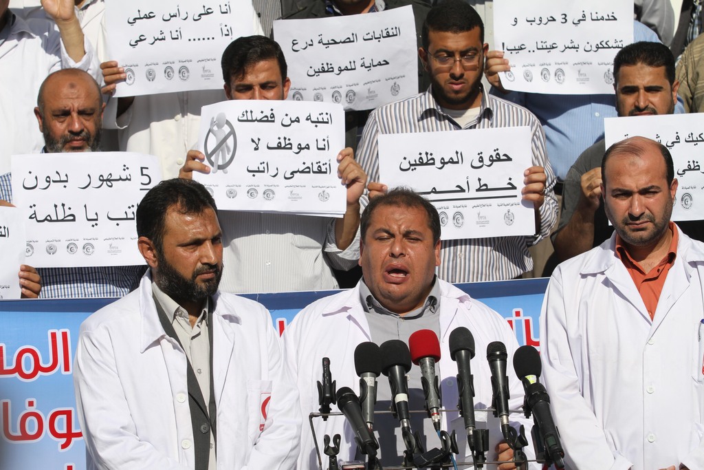 أغلقت الوزارات والمؤسسات والهيئات الحكومية الأربعاء أبوابها استجابة لإعلان نقابة الموظفين في القطاع العام عن إضراب شامل احتجاجًا على استمرار عدم دفع حكومة التوافق لرواتبهم منذ أشهر. وتغيب آلاف الموظفين عن أعمالهم بناءً على الإضراب المُعلن، فيما أغلقت كافة أبواب الوزارات والمؤسسات التزاما بقرار النقابة، فيما سينظم هؤلاء وقفة احتجاجية أمام مقر وزارة الصحة في غزة. وأكدت نقابة المهن الصحية شرعية موظفين القطاع الصحي في غزة، وحقهم في استلام رواتبهم بوقتها المحدد أسوة بزملائهم في رام الله. وقال رئيس النقابة عبد القادر العُطل خلال وقفة أمام وزارة الصحة بغزة إن الموظف اكتسب شرعية على مدار سنوات عمله، وخلال 51 يومًا دون انقطاع إبان العدوان الإسرائيلي الأخير على القطاع. واستنكر إصرار حكومة التوافق على تعزيز الانقسام عبر إعلانها عن مسابقات توظيف للقطاع الصحي في الضفة دون غزة، مطالبةً الحكومة بعدم التميز بين الموظفين. [title]تصعيد سلمي[/title] وكانت النقابة أعلنت تصعيد إجراءاتها خلال وقفة نظمتها أمام مجلس الوزراء بغزة عقب تنفيذهًا إضرابًا جزئيًا بكافة الوزارات والهيئات والمؤسسات الحكومية، إضافة إلى المدارس الحكومية. وحملت أطراف المصالحة الوطنية والرئاسة وحكومة التوافق الوطني مسؤولية استمرار الأزمة وآثارها الكارثية على 50 ألف أسرة، مطالبةً إياهم بإيجاد حلول سريعة لها. وأكدت أنها لن تعترف بأي اتفاقات تهضم حقوق الموظفين أو توصيات لجان يشتم منها رائحة الإقصاء والإحلال غير المبرر، محذرةً كل من تسول له نفسه التلاعب بمصير الموظفين في غزة والتطاول عليهم والتقليل من دورهم أو التشكيك في كفاءتهم. وقالت النقابة: "لن نعترف بشرعية حكومة تتنكر لشرعية موظفينا المدنيين والعسكريين ولحقوقهم العادلة"، مؤكدةً على أن كل الخيارات باتت مفتوحة أمامها لنيل حقوق الموظفين. وشددت على أن مطالبها تتلخص بالإقرار العلني والمكتوب بقانونية وشرعية الموظفين بغزة، واستحقاقاتهم الإدارية والمالية بأثر رجعي، ودمجهم مع موظفي الدولة بسلم مالي وإداري موحد، وصرف رواتبهم بالتزامن مع الموظفين الآخرين، وإعادة تفعيل برامج التشغيل المؤقت لاستيعاب الأعداد الكبيرة من الخريجين والاستمرار في تشغيل موظفي العقود وصرف مستحقاتهم المالية. وأكدت النقابة على مبدأ رفض حل مشكلة الموظفين المستنكفين على حساب الموظفين، وأنها لن تسمح بعودتهم إلا بعد الاعتراف بهم وصرف رواتبهم. ولم يتلق نحو 46 ألف موظف يتبعون لحكومة غزة السابقة رواتبهم منذ أكثر من عام بشكل منتظم، ولم يتم حل قضيتهم رغم تشكيل حكومة الوفاق في الثاني من يونيو الماضي. وأطلقت الحكومة وعود متكررة بصرف سلف لهؤلاء الموظفين وحل قضيتهم عبر لجنة قانونية وإدارية شكلتها لهذا الغرض لبحث دمجهم ضمن سلم موظفي الدولة.