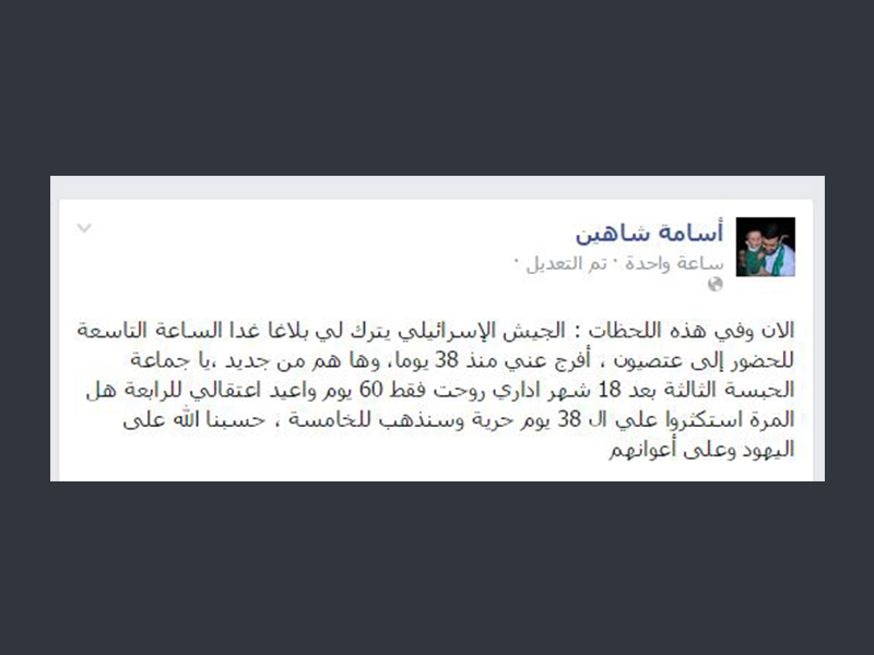 سلّمت قوات الاحتلال مساء الأربعاء مدير مركز أسرى فلسطين أسامة شاهين بلاغ مقابلة لمخابراته بعد مداهمة منزله في قرية امريش جنوب دورا الخليل. وأفاد شاهين لوكالة "صفا" أنّ آلية عسكرية لجيش الاحتلال حضرت إلى منزله مساء، وتركت له بلاغ مقابلة لضابط مخابرات الاحتلال بمعسكر عتصيون صباح غد الخميس. وكانت قوّات الاحتلال أفرجت عن شاهين قبل (38 يوما) بعد اعتقال إداري استمر ثلاثة شهور.