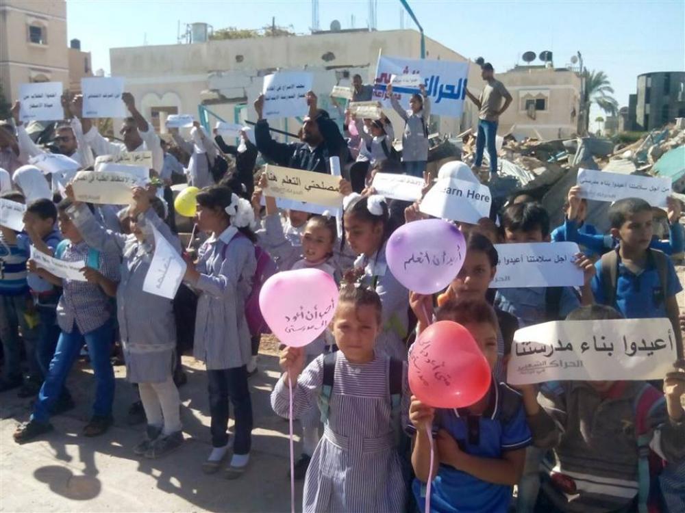 نظم الحراك الشعبي في بلدة خزاعة شرق محافظة خانيونس جنوب قطاع غزة الأحد وقفة احتجاجية في مدرسة البلدة الابتدائية، لمطالبة وكالة الغوث وتشغيل اللاجئين أونروا بالإسراع بإعمار المدرسة، التي تعرضت لتدمير اجزاء منها خلال العدوان الأخير. ورفع طلاب المدرسة لافتات كتب عليها: " سارعوا بتأهيل مدرستي، مصلحتي التعلم هنا، لا لاكتظاظ الطلبة في الفصول.." وغيرها من الشعارات المتعلقة بمطالبهم من الوكالة. وطالب المشاركون في الوقفة "أونروا" بالقيام بواجبها والعمل بجدية لترميم المدرسة، خاصة ان معظم غرفها يمكن ترميمها وتهيئتها للدراسة، مشيرين إلى أن الوكالة قامت بإصلاح وترميم مدارس بمناطق أخرى. كما طالبوا بتعيين مشرفيين اجتماعيين، لأن طلاب البلدة ما زالوا يعانون من مشاكل نفسية واجتماعية، جراء تعرضهم لمشاهد ومواقف صعبة خلال العدوان الأخير، وما تعرضت له البلدة من حصار وإعدامات جماعية وتدمير هائل في المباني والشوارع. واشتكى أهالي الطلاب من آلية نقل أبنائهم يوميا إلى مدارس أخرى بديلة عبر حافلات خصصتها الوكالة، مشيرين إلى أنه تم الاتفاق مع الوكالة لإرسال 18 حافلة، لكنها أرسلت فقط من 8 إلى 10 حافلات، وهي لا تكفي لعدد الطلبة، الذين يضطرون للتكدس في الحافلات.