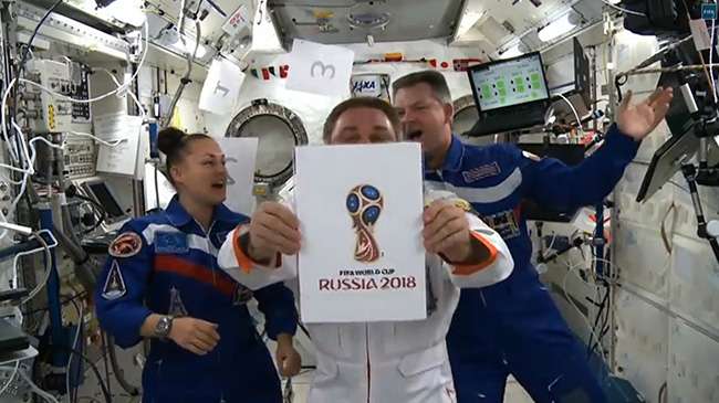 قدم رواد فضاء روس مساء الثلاثاء شعار كأس العالم الذي ستحتضنه بلادهم عام 2018 من محطة الفضاء الدولية، في حدث تابعه مباشرة من الأرض رئيس الاتحاد الدولي لكرة القدم (فيفا) جوزيف بلاتر. وقام رائد الفضاء ماكسيم سوراييف بعد تنازلي قبل تقديم الشعار على الرغم من الآثار المرئية لانعدام الجاذبية داخل المحطة، وفي نفس الوقت عُرض شعار البطولة على واجهة مسرح بولشوي التاريخي بالعاصمة الروسية. ويذكر التصميم بذلك الخاص بمونديال 2014، ويظهر فيه كأس العالم باللون الأحمر، الذي يرمز لروسيا، وبداخله جسم لاعب كرة قدم رافعاً ذراعيه للأعلى في إشارة للنصر. وكان بلاتر واللاعب الإيطالي السابق فابيو كانافورو، هما نجما حفل تقديم شعار البطولة. وصرح بلاتر الذي رفض ما يثار بخصوص مقاطعة البطولة بسبب تدخل روسيا المفترض في الصراع الأوكراني أن: "تقديم الشعار يعد بمثابة صافرة الانطلاق لكأس العالم". وقال أمين عام "الفيفا" جيروم فالكه رداً على سؤال قبل الكشف عن الشعار: "أعتقد أن الشعار هو الكأس نفسها، إنها كأس العالم لكرة القدم الذي تنظمه روسيا كما كانت تنظمه البرازيل، هذا الذوق للبلد المضيف، لذلك فمن كأس العالم نختار طعم البلد وهذه الشارة، وهذا مهم جداً لأن الشعار هو ما سترونه في جميع أنحاء العالم، وسوف يكون استخدامه في جميع المطبوعات لاحقاً".