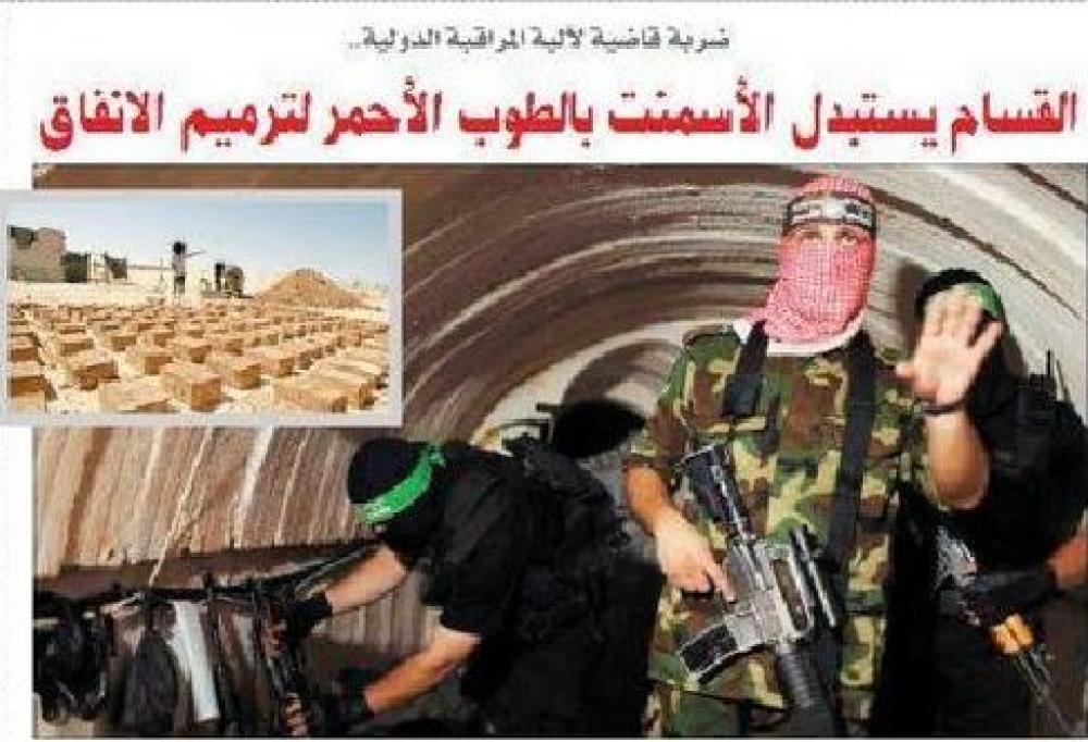 كشف مصدر قيادي في كتائب القسام الجناح العسكري لحركة حماس عن ألية جديدة لبناء وترميم الأنفاق التي تستخدمها المقاومة الفلسطينية في عملياتها العسكرية كبديل عن الإسمنت. ونقلت صحيفة "الاقتصادية" المحلية عن المصدر الذي فضل عدم الكشف عن هويته أن القسام لجأ لاستخدام الطوب الأحمر في بناء الأنفاق، حيث أظهرت الدراسات الهندسية مدى فعاليته وقوته وتوفيره للمواد الخام والمال. وأضاف أن الطوب الأحمر يعطي قوة هندسية توازي قوة الأسمنت، الأمر الذي يعطيه أولوية في الاستخدام في ظل عدم توفر الأسمنت في الوقت الحالي. ويشكل هذا التحول إذا ما تم تطبيقه فعلياً في هذه المرحلة ضربة كبيرة للآلية الدولية الخاصة بالرقابة على مواد البناء، بما فيها الأسمنت التي طرحها المبعوث الدولي لعملية السلام في الشرق الأوسط روبرت سري والتي وافق عليها الطرفان الفلسطيني والإسرائيلي والتي تقوم على آليه رقابة وفق نظام حاسوبي ، وكاميرات على المصانع وأجهزة تتبع عن بعد كالـ"jps “. وينتج الطوب الأحمر من خلال حرق الطين الزراعي بدرجات حرارة معينة وينتج منه مكعبات صلبة من الطين تستخدم بكثرة في بناء المباني والأبراج في مصر والسودان.