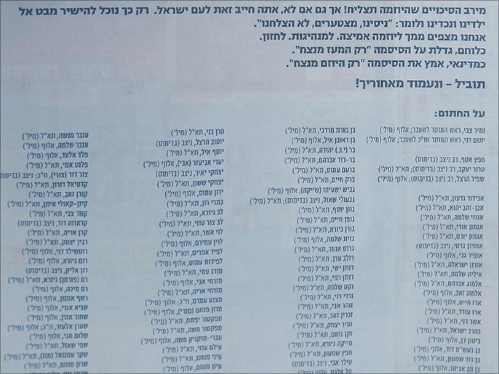 دعا أكثر من 100 جنرال إسرائيلي متقاعد رئيس حكومة الاحتلال بنيامين نتنياهو للإسراع في تسوية الصراع مع الفلسطينيين من خلال تسوية إقليمية مع الدول العربية، واعتبروها ضمانة وحيدة لأمن وازدهار "إسرائيل". وتتميز الدعوة بأن أغلبية الموقعين عليها الـ105 من جنرالات الاحتياط، وأبرزهم تسفي زمير وداني يتوم، وهما رئيسان سابقان للموساد، إضافة إلى يعقوب تيرنر وأساف حيفتس، وهما قائدان سابقان للشرطة. وتضم القائمة أيضًا القائد السابق لسلاح الجو أفياهو بن نون، وعضو الكنيست عن حزب "الحركة" رئيس الاستخبارات العسكرية سابقًا الجنرال شلومو غازيت، وعضو الكنيست (الحركة) الجنرال عمرام متسناع، وجنرال الاحتياط إليعاز شطيرن، وأورن شحور، وهو باحث وقائد سابق في الاستخبارات والإدارة المدنية. ويؤكد الموقعون على العريضة -التي جاءت على شكل إعلان مدفوع الأجر في وسائل إعلام إسرائيلية- تأييدهم لفكرة الدولتين ويبدون مخاوفهم من حروب مستقبلية. وتتحدث العريضة عن "دولتين لشعبين"، ولكنها لم تقدم حلولا لقضايا الوضع النهائي الدائم. وتتابع "حان الوقت لأن نتحمل مسؤوليتنا عن مستقبلنا واستغلال الفرصة التاريخية بعد العملية العسكرية في غزة". وتدعو "إسرائيل" إلى تبني المفهوم السياسي الإقليمي والشروع بمفاوضات مع الدول العربية والفلسطينيين (الضفة وغزة معا) استنادًا للمبادرة العربية للسلام والتفاوض حول مضامينها. العريضة التي نشرت تفاصيلها "الجزيرة نت" وتحمل عنوان "مفهوم سياسي إقليمي.. دولتان لشعبين" تذكر نتنياهو بإعلانه عن أفق سياسي ومصالح مشتركة، وتقول إنه يعرف برغبة الدول العربية المعتدلة في تحقيق تسوية مع إسرائيل لمواجهة خطر مشترك وتثبيت الاستقرار في الشرق الأوسط. وتقول العريضة موجهة الحديث لنتنياهو، "أنت تعلم أن هذا هو الرد الحقيقي للتهديد الإيراني ولتهديد إرهاب (تنظيم الدولة الإسلامية) داعش، وحماس وحزب الله والقاعدة وغيرها". كما تنبهه بأن تسوية مع الفلسطينيين وضمان الاستقرار والأمن والازدهار الاقتصادي والاجتماعي والإفلات من غلاء المعيشة هي "أهداف تتحقق فقط بتسوية إقليمية". ويدلل أصحاب العريضة على حيوية التسوية الإقليمية بالإشارة إلى فشل متكرر لفكرة المفاوضات الثنائية مع الفلسطينيين، ويقولون إنهم يتوقعون من نتنياهو مبادرة "شجاعة قيادةً ورؤية". وتضيف العريضة "هناك احتمالات كبيرة لنجاح هذه المبادرة الإقليمية، ولكن حتى لو لم يتوافر الحظ لها فأنت مطالب كرئيس حكومة بالمحاولة كي نقول لأولادنا لقد جربنا ولم ننجح". وتتابع "كمقاتل سبق أن قلت إن الشجاع من يفوز، وكسياسي عليك تبني قول (المبادر فقط ينجح)، فقم بالقيادة ونحن من خلفك". ويوضح الجنرال المتقاعد من الشرطة أساف حيفتس، وهو من موقعي العريضة، للجزيرة نت أنها "جاءت على خلفية نجاح حكومة نتنياهو في إقناع الإسرائيليين بعدم وجود شريك فلسطيني وبانعدام مستقبل للسلام، والترهيب من داعش وإيران". ونوه حيفتس إلى أن مجموعة الموقعين أطلقت رسالة جماعية لأن نتنياهو يعلن تأييده لتسوية الدولتين من خطاب بار إيلان عام 2009 لكنه لا يفعل شيئا على الأرض لتطبيقها. وبشأن إبقاء قضايا الحل الدائم مبهمة، أوضح حيفتس أن مجموعة رجال الأمن اكتفت بتصور مبدئي كقاسم مشترك لها، مشيرا إلى أن المبادرة العربية للسلام تنطوي على جوانب إيجابية لم تعاينها إسرائيل بعمق. وبالمقابل حمل السفير الإسرائيلي في واشنطن سابقا على موقعي العريضة، واتهم السلطة الفلسطينية بقلة المسؤولية والمبادرة وإهمال الاحتياجات الأمنية لإسرائيل، وذلك في مقال نشرته صحيفة "يسرائيل هيوم". واكتفى أوفير جندلمان المتحدث باسم نتنياهو بإجابة فاترة ومقتضبة على أسئلة الجزيرة نت حيث قال "نتنياهو سيواصل الإصرار على المصالح الوطنية والأمنية وصون الحقوق التاريخية اليهودية في القدس". وأضاف جندلمان "وبنفس الوقت سيبذل جهودا واعية للحصول على تسوية سلمية تؤدي إلى الاعتراف الفلسطيني بإسرائيل كدولة للشعب اليهودي". من جانبه، رحب ال