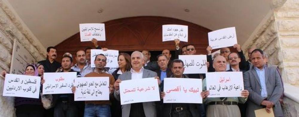 نفذ عشرات الصحفيين الأردنيين الثلاثاء وقفة أمام مقر النقابة في عمان احتجاجًا على الانتهاكات الإسرائيلية التي يتعرض لها المسجد الأقصى المبارك، والاعتداء على الفلسطينيين. ورفع الصحفيون خلال الوقفة شعارات يؤكدون فيها على عروبة القدس، وعدم السماح للإسرائيليين باختطاف الأقصى. وقال نقيب الصحفيين الأردنيين طارق المومني في كلمته إن هذه الوقفة تأتي استنكارًا للانتهاكات الإسرائيلية للمسجد الأقصى والقدس المحتلة، وسط صمت عربي وإسلامي ودولي، داعيًا إلى استخدام كل الوسائل للضغط على "إسرائيل" التي اتبعت كل السبل للقضاء على الشعب الفلسطيني وتدميره. وأضاف أنه خلال تشرين الأول الماضي شهدت مدينة القدس أكثر من 250 انتهاكًا، مشيرًا إلى أن الإسرائيليين يسعون إلى هدم المسجد الأقصى، وإقامة هيكلهم المزعوم. وتابع "لا يمكن أن ينعم العالم بالأمن والسلام طالما لم يكن هناك حل عادل للقضية الفلسطينية"، موجهًا التحية لصمود المقدسيين تعبيرًا عن تمسكهم بأرضهم ورفضهم للاحتلال. ودعا المومني المجتمع العربي والإسلامي والدولي لنصرة المقدسيين، ووقف المخططات التوسعية والاستيطانية بالمدينة المقدسة. وثمن وقفة الشعب الأردني مع فلسطين من خلال المسيرات والاعتصامات التي شهدتها المملكة رفضًا لهذه الاعتداءات، كما ثمن خطوة استدعاء السفير، داعيًا وسائل الإعلام لفضح ممارسات الاحتلال الإسرائيلي ضد الفلسطينيين والمقدسات في القدس.