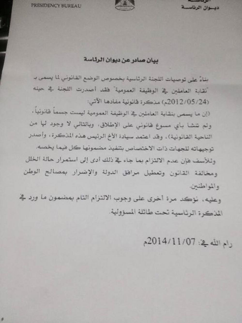 أدى تدخل رئيس وزراء حكومة الوفاق رامي الحمدالله شخصيا إلى الإفراج عن رئيس نقابة الموظفين العموميين في الضفة الغربية بسام زكارنة، ونائبه معين عنساوي مساء الخميس، بعد أسبوع من اعتقالهما دون أن يعني ذلك إنهاء كليا للملف. إذ أعلنت رئاسة الوزراء أن الإفراج عن زكارنة وعنساوي جاء لأسباب صحية وبكفالة شخصية من الحمدالله ،لحين محاكمتهما، في رسالة ظهرت أن الحكومة لا ترغب في التصعيد مع النقابات، لكنها في نفس الوقت وجَّهت رسالة تهديد لها بعدم التصعيد. وعلى الرغم من اختلاف كثيرين مع زكارنة وسلوك نقابة الموظفين العموميين وأجندتها المختلفة، التي أثارت نقاشا وأدخلت العمل النقابي بالعمل السياسي، فإن كثيرين وقفوا ضد الإجراءات التي اتخذت حماية لمبدأ العمل النقابي، واستنكارا للاعتقال تحت ما يسمى على ذمة الرئيس. ويقول النائب الثاني لرئيس المجلس التشريعي حسن خريشة لوكالة "صفا" إن الإجراءات التي تم اتخاذها بحق ممثلي النقابات مرفوضة وغير قانونية، مطالبا بحماية العمل النقابي. ويؤكد خريشة أن التمادي في الاعتقالات من خلال إصدار مذكرات اعتقال بحق محتجين على تلك الإجراءات، تماما كما حدث مع مدير عام المجلس التشريعي إبراهيم خريشة، فيه تعسف في الاعتقال. واعتقلت شرطة رام الله زكارنة وعنساوي لمدة أسبوع، علما أن حكما قضائيا صدر الثلاثاء الماضي قضي بتمديد اعتقالهم مدة 15 يوما. وجرى اعتقال النقابيين على "ذمة" الرئيس عباس، ووجهت اتهامات لهما بالانتساب لجمعية غير مشروعة "قانون 183 فقرة 2" والتهاون الوظيفي "قانون 182" والاخلال بأحكام القانون والقرارات القضائية "قانون 160". وكانت شرطة رام الله احتجزت نقيب المهن الصحية أسامة النجار لعدة ساعات يوم الاثنين الماضي على نفس القضية، قبل أن تقوم بالإفراج عنه. كما داهمت دورية من الشرطة الليلة الماضية مقر المجلس التشريعي في رام الله لاعتقال الأمين العام للمجلس إبراهيم خريشة على خلفية بيان صدر من موظفي التشريعي الذي يطلق عليهم قانوناً موظفي الأمانة العامة تضامنا مع زكارنة وعنساوي. وسبق اعتقال النقابيين إصدار ديوان الرئاسة بيانا جاء فيه أن نقابة العاملين في الوظيفة العمومية "ليست جسماً قانونياً، ولم تنشأ بأي مسوغ قانوني على الإطلاق، وبالتالي لا وجود لها من الناحية القانونية ". [title]قانون مكبل[/title] ويشير الباحث الحقوقي محمد كمنجي ل"صفا"، إلى أن خطورة ما جرى تكمن في أن الاعتقالات تمت تحت ما يسمى "على ذمة الرئيس" وهذا إجراء غير قانوني، فالأصل في المتخاصمين التوجه للقضاء. ويؤكد كمنجي أن حق الإضراب والعمل النقابي مكفول في أحكام القانون الأساسي الفلسطيني والعهد الدولي الخاص بالحقوق المدنية والسياسية النافذ في دولة فلسطين لأنها وقعت عليه. ويشير إلى أن السلطة تستند في إجراءاتها ضد نقابة الموظفين العموميين إلى القرار بقانون رقم (5) لسنة 2008، بشأن تنظيم ممارسة حق الإضراب في الخدمة المدنية "لكننا كحقوقيين نطالب بإلغاء هذا القانون لأنه يتعارض مع العهد الدولي الخاص بالحقوق الاقتصادية والاجتماعية، ويخالف أحكام هذا العهد والقانون الأساسي الذي أكد على هذا الحق". وكان الموقف تفجر بين نقابة الموظفين العموميين والحكومة عقب سلسلة الإضرابات التي تم خلالها تعطيل عمل الوزارات، بسبب انعقاد جلسات المحاكمة في قضية القذف والتشهير بين وزير العمل السابق أحمد المجدلاني وزكارنة، وهو ما اعتبر تعسفا في استخدام الإضراب وخروجا عن مبادئ العمل النقابي. وكان إضراب يوم الخميس 30 أكتوبر الماضي بسبب جلسة محاكمة زكارنة، هو الحد الفاصل الذي تسبب في تفجر الأوضاع والذي بسببه صدرت أوامر الاعتقال. ويقول النقابي عبد الحكيم ناصر ل"صفا" إنه من حيث المبدأ يجب أن تكون حرية العمل النقابي محفوظة، ويجب أن تتم كل الإجراءات في إطار القانون، لكن نقابة الموظفين العموميين مارست الإضرابات بشكل تعسفي وخارج الأطر المتعارف عليها محليا ودوليا في التعاطي مع الحقوق المطلبية. ويضيف ناصر أن خلافا شخصيا بين رئيس ن