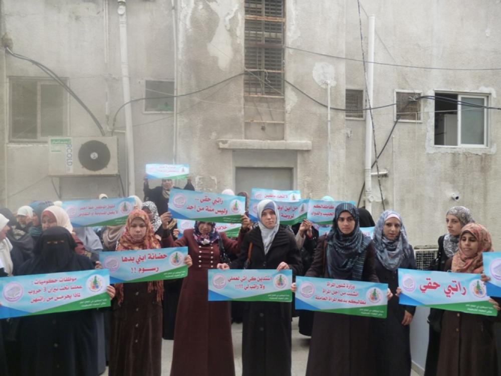 طالبت الموظفات في حكومة غزة السابقة حكومة الوفاق الوطني بتحمل مسئوليتها في الدفاع عن حقوق المرأة الفلسطينية ودرء العنف القائم نتيجة حرمانها من راتبها. ودعت الموظفات خلال وقفة احتجاجية بمناسبة اليوم العالمي لمناهضة العنف ضد المرأة الاثنين بغزة، الحكومة لتوفير الاستحقاقات المالية بانتظام، والدمج الطبيعي مع الموظفين بسلم مالي وإداري موحد، وحماية حقوق الموظفات ومركزهن القانوني والاداري. ورفعت المشاركات في الوقفة الاحتجاجية لافتات تدعو لإنصاف الموظفات في القطاع الحكومي بغزة، ورفع العنف عنهن، ومنها: "راتبي حقي"، "نطالب وزارة شئون المرأة بإنصاف حق المرأة بغزة"، "حضانة ابني بدها رسوم"، وغيرها من اللافتات. ودعا الناطق باسم نقابة الموظفين بغزة خليل الزيان الحكومة للقيام بواجباتها تجاه كافة الموظفين في قطاع غزة، والعمل على حل أزمتهم الناتجة عن عدم صرف رواتبهم. وقال خلال الوقفة: "لابد أن تكرّم المرأة الفلسطينية على صبرها وتضحياتها، ونحن في النقابة نقف بجانب المرأة الفلسطينية التي تخدم الشعب الفلسطيني". بدورها، قالت الناطقة باسم ملتقى المهنيات الفلسطينيات أميرة الدريملي إن الحكومة الفلسطينية في كل مراحلها السابقة هدفت إلى النهوض بواقع المرأة الفلسطينية، وتمكينها وتعزيز أدوارها، مبينة أن عدد الموظفات في القطاع الحكومي 10603 موظفة بغزة. وأكدت الدريملي خلال الوقفة التي نظمت أمام مقر وزارة شئون المرأة بغزة أن دور المرأة مازال مكونا أساسيا وأصيلا في عملية التحرير والبناء، وخاصة في هذه المرحلة الحساسة في قضيتنا. وأوضحت أن دور الحكومة متمثلة في وزارة شئون المرأة هو تعزيز مشاركتها وتوفير مناخ مناسب لدعم المرأة وروفع مكانتها، مطالبة الوزارة بتحمل مسئوليتها في الدفاع عن المرأة الفلسطينية ودرء العنف القائم نتيجة حرمانها من راتبها. وطالبت الدريملي كافة المؤسسات النسوية والحقوقية والدولية بالوقوف بجانب المرأة الفلسطينية وتمكينها من حقوقها. وفي رسالة إلى رئيس الوزراء بحكومة الوفاق الوطني رامي الحمدالله، طالبت الممثلة عن موظفات وزارة الصحة بغزة إسراء العمراني بالوقوف الجاد عند مسئولياته تجاه المرأة الفلسطينية في القطاع الحكومي بغزة، وكافة الموظفين على حد سواء واتخاذ موقف جاد ومسئول يكافئ صمود النساء الغزيات. وناشدته خلال الوقفة بتوفير الاستحقاقات المالية بانتظام، والدمج الطبيعي مع الموظفين بسلم مالي وإداري موحد، وحماية حقوق الموظفات ومركزهن القانوني والاداري وصرف الرواتب بالتزامن مع الموظفين الآخرين.