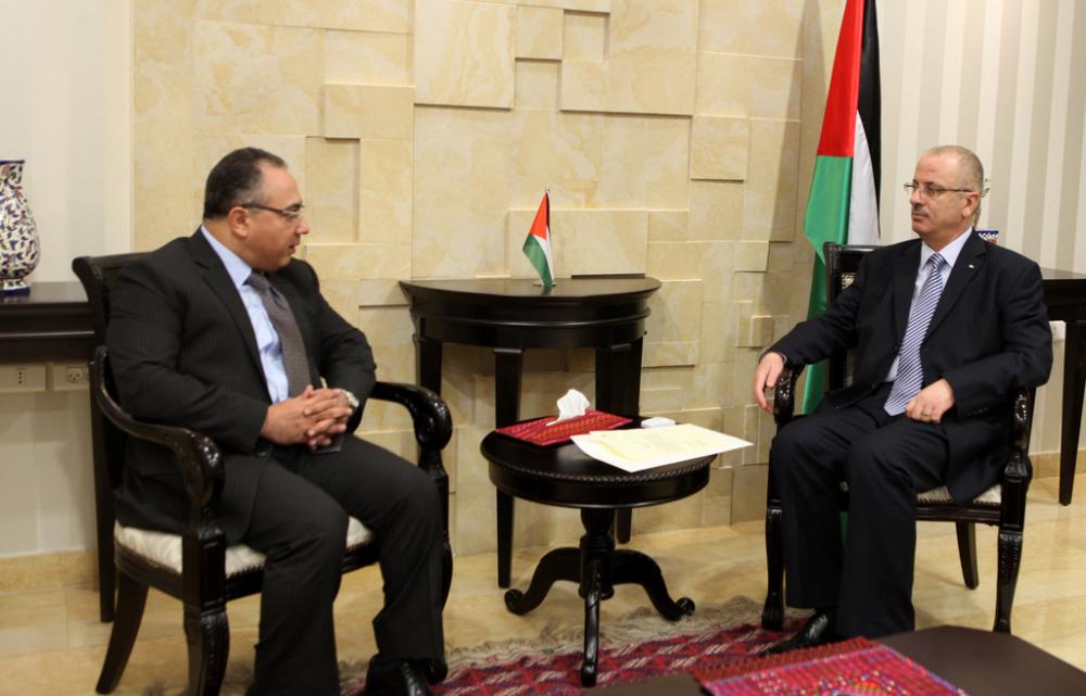 بحث رئيس الوزراء رامي الحمد الله الاثنين مع السفير المصري لدى فلسطين وائل عطية آخر تطورات عملية إعادة إعمار قطاع غزة. وأشار الحمد الله لدى لقائه السفير عطية في مقر مجلس الوزراء برام الله إلى الاتصالات الجارية بين اللجان المنبثقة عن مؤتمر القاهرة من أجل التنسيق وتسهيل عملية إعادة الإعمار. وتسلم الحمد الله من السفير عطية رسالة تهنئة لمناسبة ذكرى إعلان الاستقلال من رئيس الوزراء المصري إبراهيم محلب.