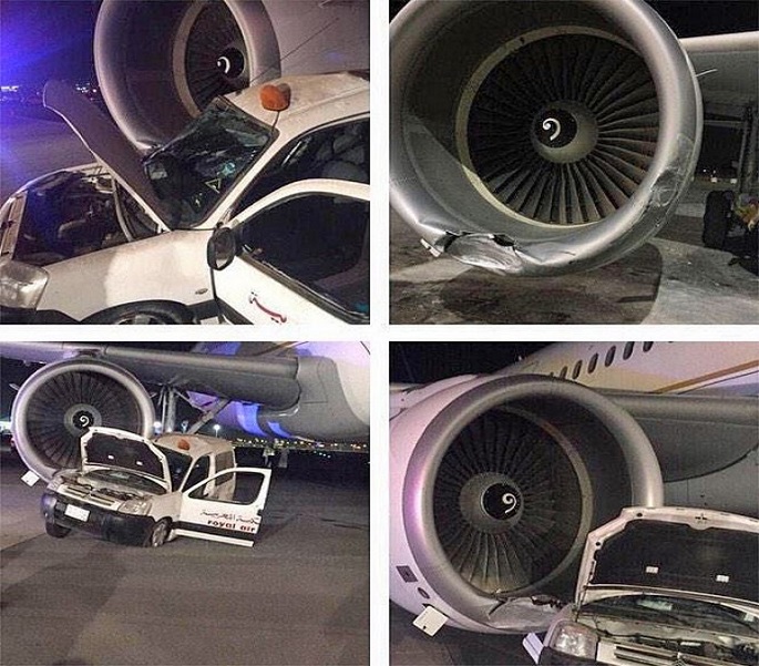 وكانت الطائرة خالية من الركاب، لكن بعض الأضرار لحقت بالمحرك الأيمن للطائرة فيما انسحق هيكل السيارة.