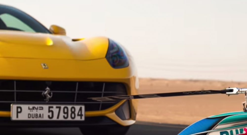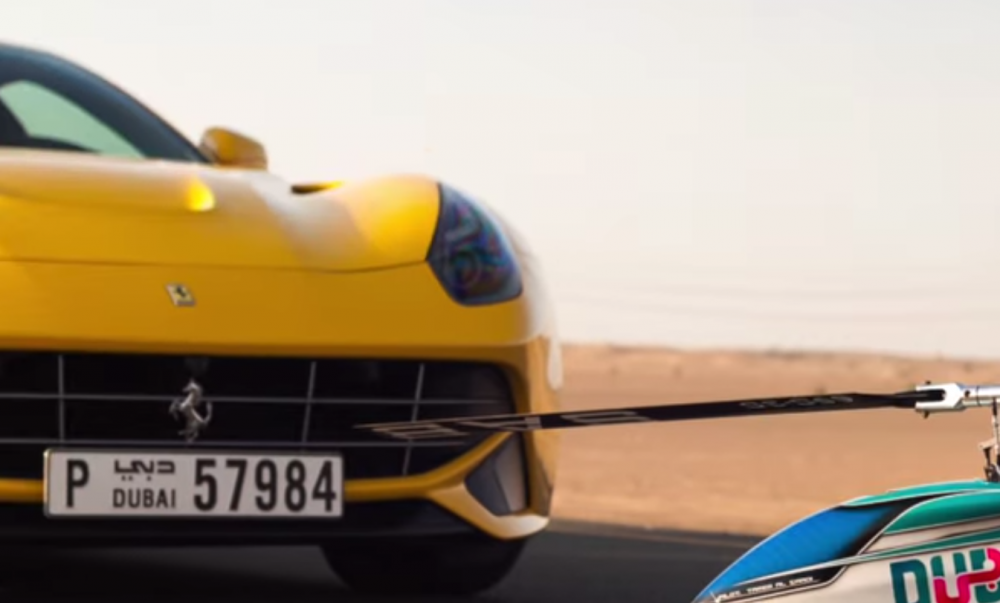دخلت سيارة (Ferrari F12 Berlinetta) في سباق مع طائرة هليكوبتر RC، وذلك في أحد الطرقات بصحراء دبي.