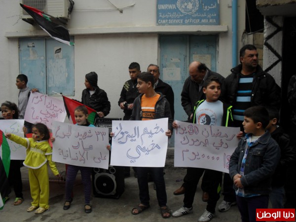 ورفع المعتصمون لافتات عبرت "عن صمود أهل المخيم بالرغم من كل الظروف التي يمرون بها نتيجة الحصار المفروض عليهم منذ ثلاث سنوات".