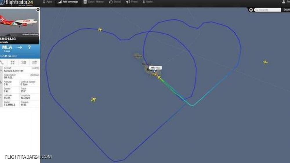 واندهش مستخدمو خدمات متابعة حركة الطيران على الانترنت بعد أن لاحظوا أن شكل مسار إحدى الطائرات التي أقلعت من مطار مالطا الدولي أصبح على شكل قلب أثناء دورانها حول الجزيرة.