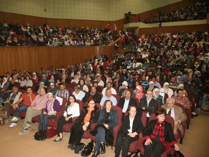 استقبل 3000 من مختلف الشرائح الاجتماعية والعلمية بالأردن الشاعرين الفلسطينيين مريد البرغوثي ونجله تميم في أمسيتهما الشعرية التي نظمتها مجموعة "انكتاب" المجتمعية ومؤسسة عبد الحميد شومان بقصر الثقافة في العاصمة الأردنية مساء أمس السبت بحضور مصريين ولبنانيين.