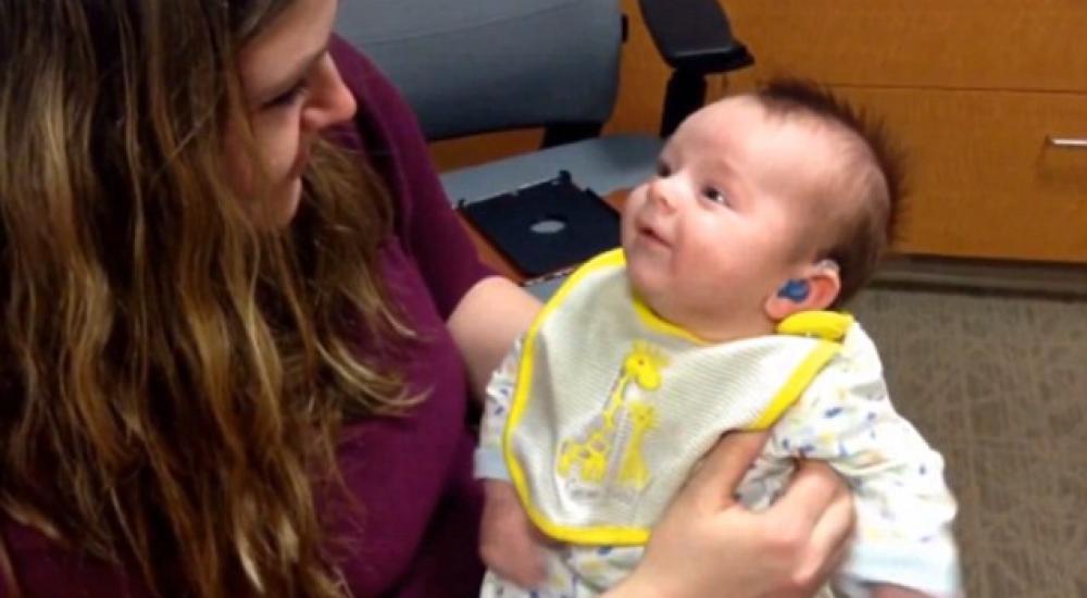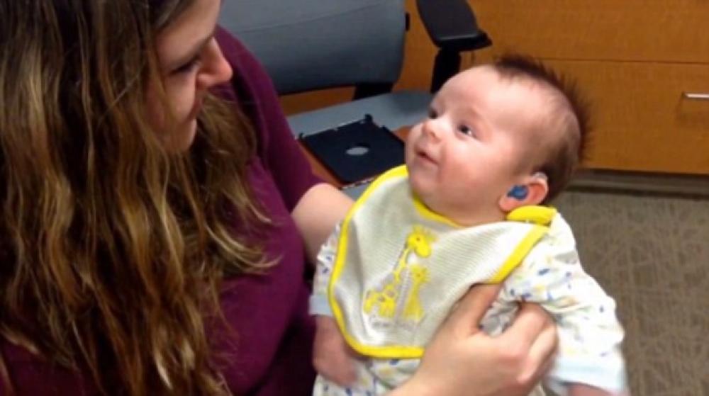 حظي مقطع نشر على موقع يوتيوب الشهير بإعجاب أكثر من مليون مشاهد بعد سماع رضيع لصوت والدته للمرة الأولى من خلال سماعتي أذن.