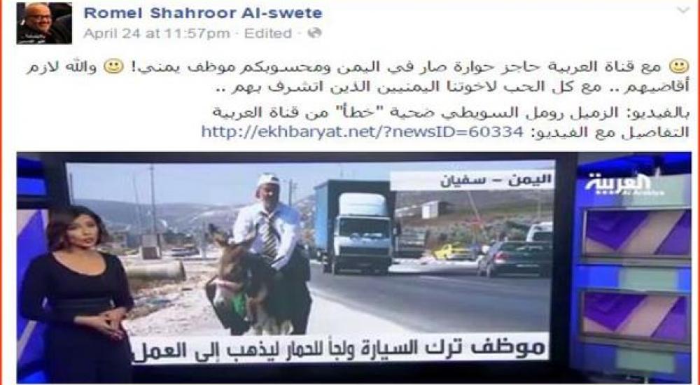 استخدمت قناة "العربية" الفضائية صورة لصحفي فلسطيني من نابلس شمال الضفة الغربية يمتطي حمارًا وكانت قد التقطت في شهر سبتمبر 2012 على أنها للأحداث الجارية في اليمن.
