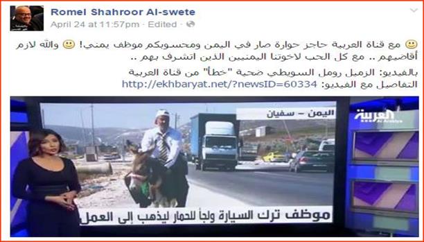 وبثت القناة صورته مؤخرًا على شاشتها على أنها لمواطن يمني يمتطي حمارًا لارتفاع أسعار الوقود، ويعاني من تدهور الحياة الاقتصادية في اليمن كبقية المواطنين اليمنيين.