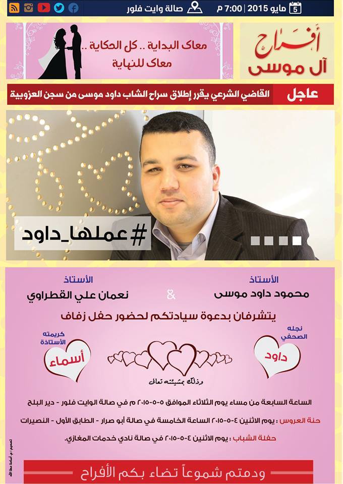 واستوحى الزميل داود موسى بطاقة فرحه الذي سيدعو من خلاله أقاربه ومعارفه من عمله في وكالة الصحافة الفلسطينية "صفا" ليشبه في تفاصيله موقعها الالكتروني.