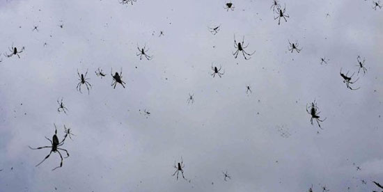 في فيلم رعب حقيقي وبالألوان الحية، أمطرت السماء ملايين العناكب من مختلف الفصائل على مدينة "جولبورم" الأسترالية، فى ظاهرة نادرة تسببت في مفاجأة سكان المدينة بوابل من العناكب المنهالة عليهم من كل حدب وصوب ما نشر الذعر بين أهالى المنطقة.