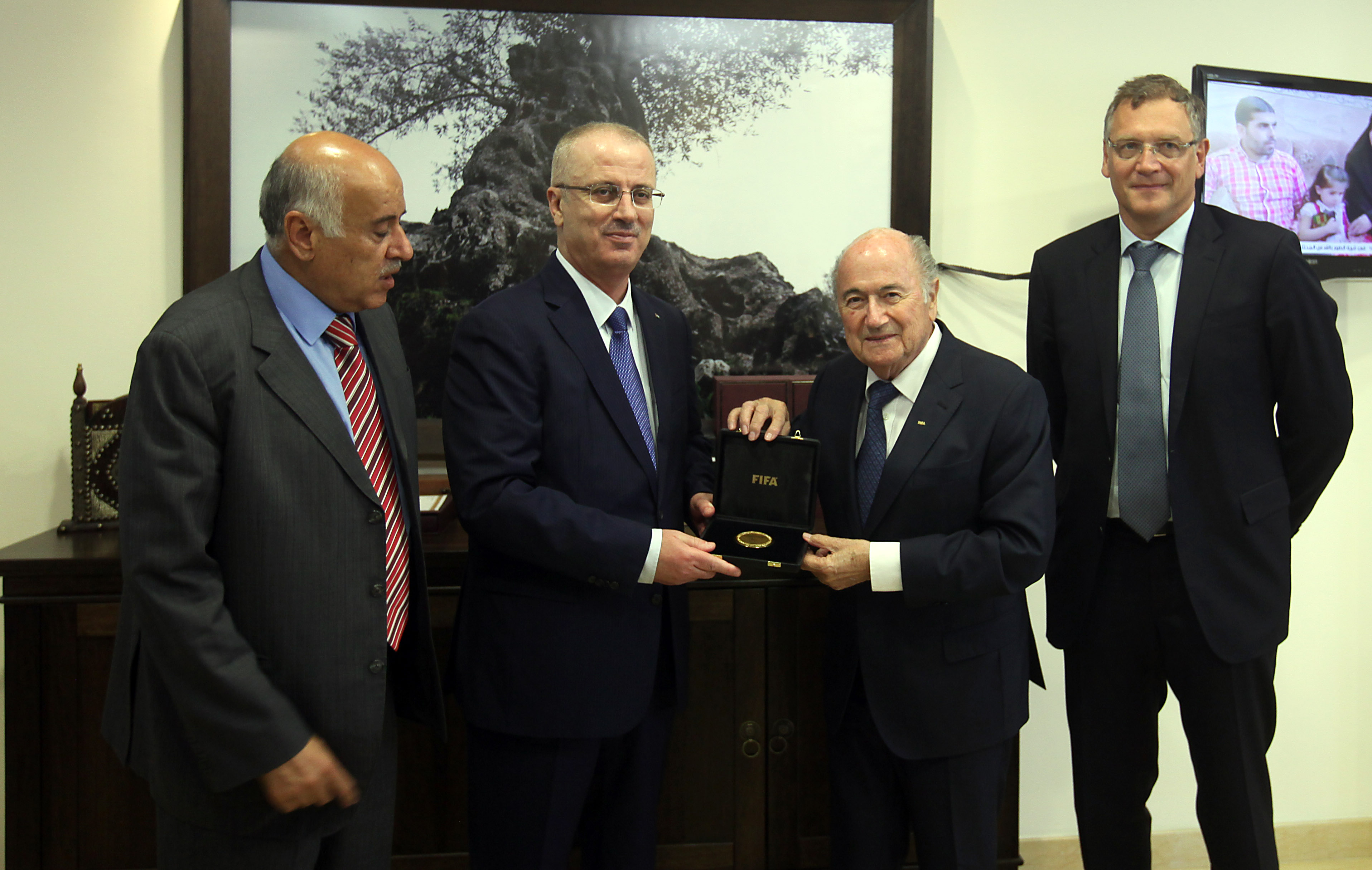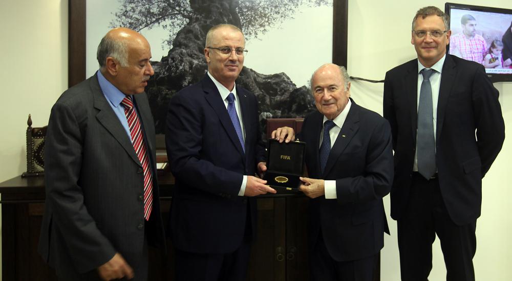 جاء ذلك خلال لقائه في مكتبه برام الله الأربعاء، رئيس الاتحاد الدولي لكرة القدم "الفيفا" جوزيف بلاتر والوفد المرافق له، بحضور رئيس الاتحاد الفلسطيني لكرة القدم اللواء جبريل الرجوب.