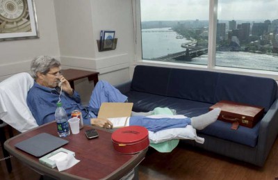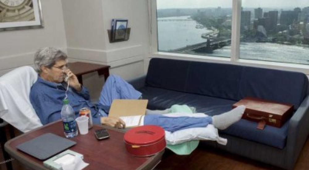 أكد وزير الخارجية الأمريكي جون كيري على "تويتر" أنه بحال جيدة ويواصل العمل، مرفقًا تغريدته بصورة له على سريره في المستشفى حيث يتعافى من اصابته بكسر في عظم الفخذ اثر سقوطه من على دراجته الهوائية قبل 10 أيام.