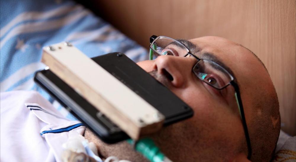 ووضعت شاشة حاسوب قربه، وأمام شفتيه فأرة صُمّمت خصيصا لحالته، حيث يغوص نحو "عشرين ساعة يومياً" في ذاك العالم الافتراضي، عالم الإنترنت والبرمجة، مستخدما لسانه وشفتيه فقط.