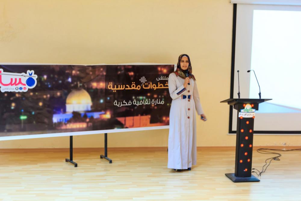 من جانبها، قالت المسؤولة في مركز مسار الثقافي عبير دويك إن فكرة الملتقى كانت محاكاة لفكرة "تيد إكس" العالمي، ولكن بشكل أبسط، مشيرة إلى أن اسم الملتقى " خطوات مقدسية" جاء ليؤكد أن طريق النجاح شاق، ويحتاج لخطوات يتخللها الكثير من الصعوبات، وبذل الجهد للوصول إلى القمة.