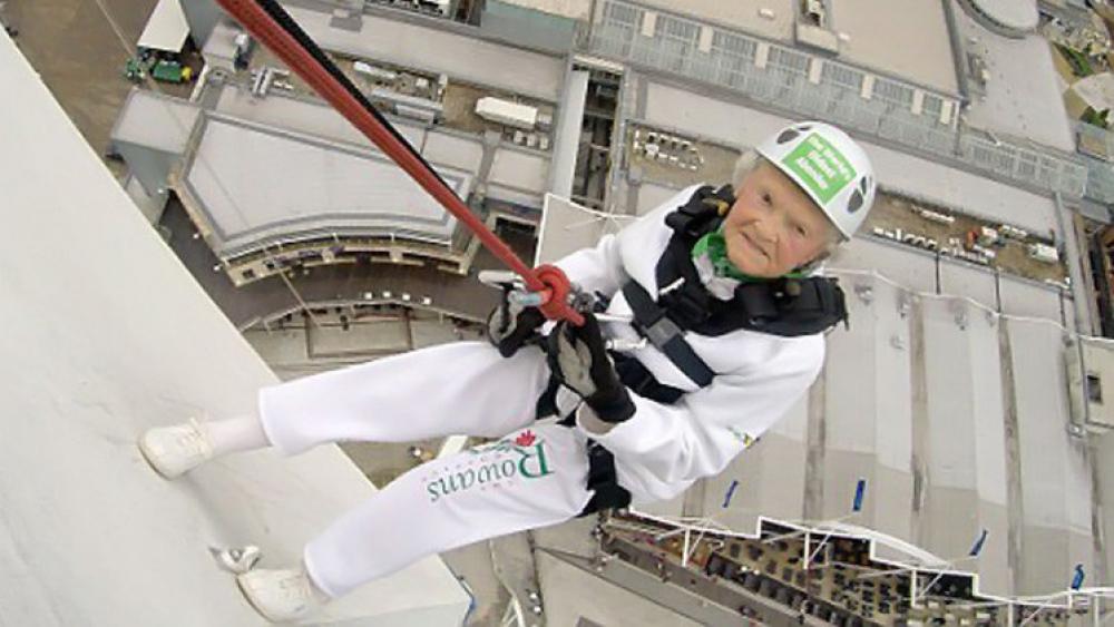فقد قامت العجوز البريطانية أودي دوريس بارتداء المعدات اللازمة من أجل أن تصبح أكبر ممارسة لرياضة الهبوط بالحبال في العالم.