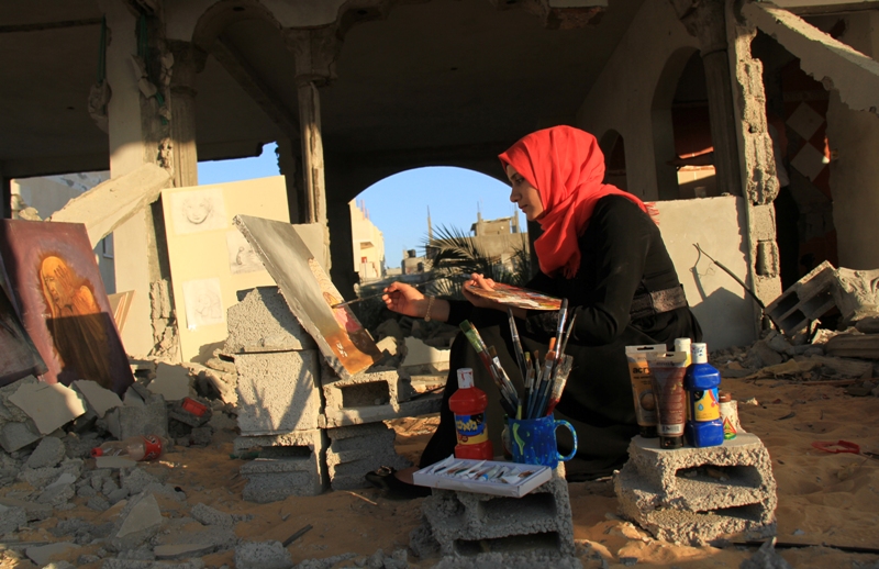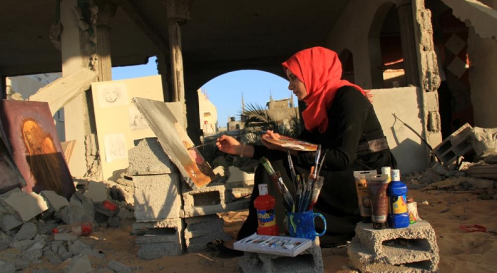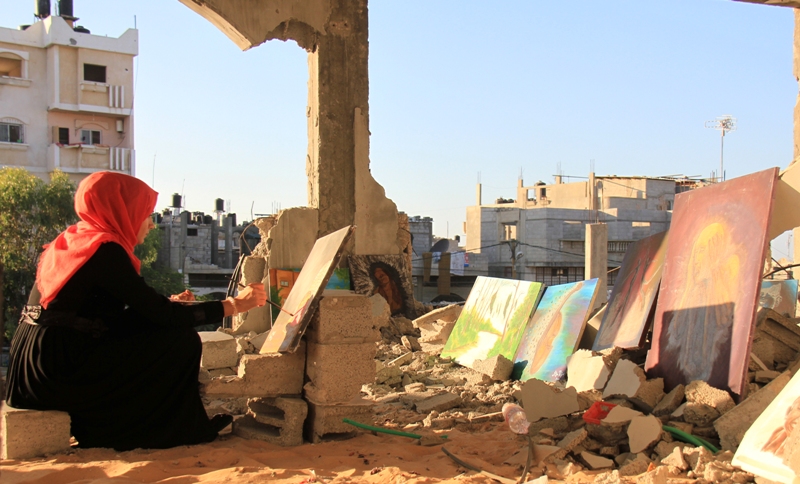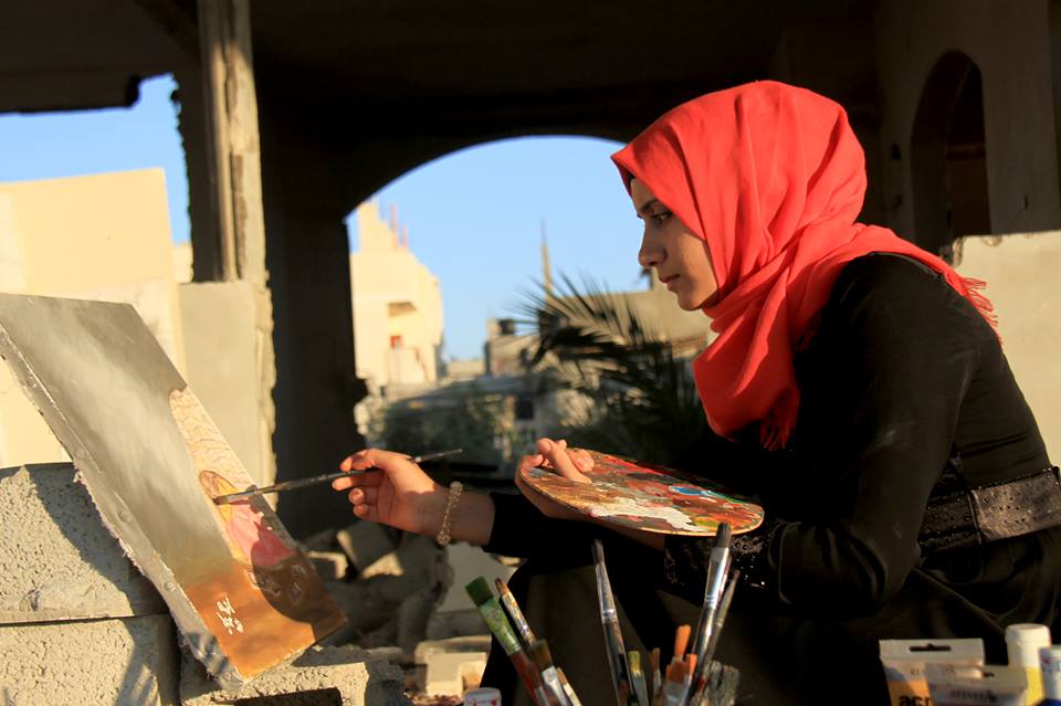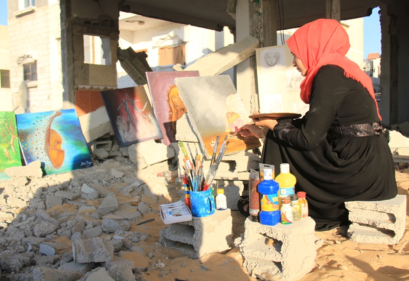 وتوجه "أية" من فوق أنقاض منزلها، ومن بين لوحاتها الفنية للعالم رسالة تقول فيها: "رسالتي كفنانة وشابة فلسطينية مهما حدث معنا من أحداث سنواصل الحياة، ومسيرتنا التعليمة والفنية، وكل واحد في مجاله، وسخرت ريشتي لعكس جمال الحياة، رغم أنها مليئة بآثار الدمار والحصار، وغيرها من مآسِ".
