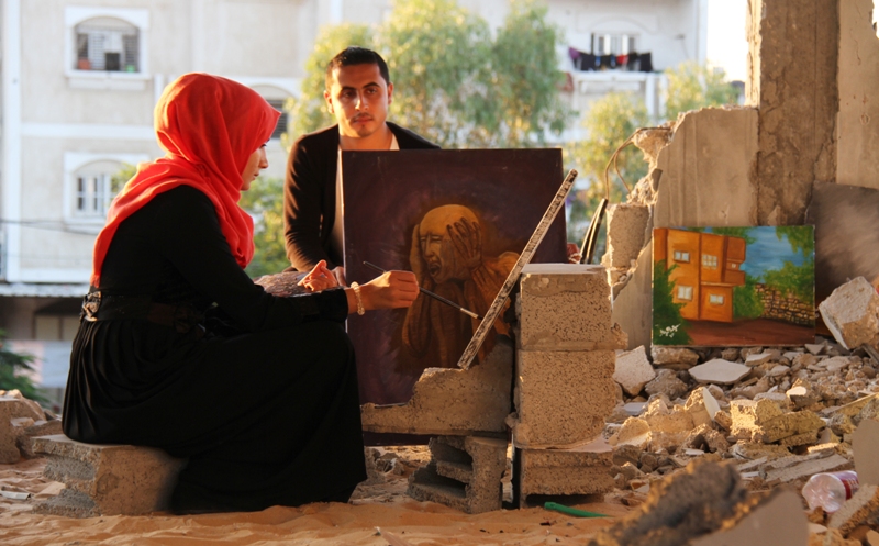 لكن الواقع المؤلم طاردها خلال رسم لوحة جمال منزلها، لتجد نفسها مُرغمة على رسم المأساة والألم الذي عاشته وأسرتها، وكافة أبناء الشعب الفلسطيني في قطاع غزة، خلال العدوان الذي استمر 51يومًا، فرسمت ريشتها طفلاً يضع يديه على أذنيه ومقرفصاً قدميه، ويصرخ ألمًا لما شاهده، تجسيدًا لانعكاسات العدوان النفسية.