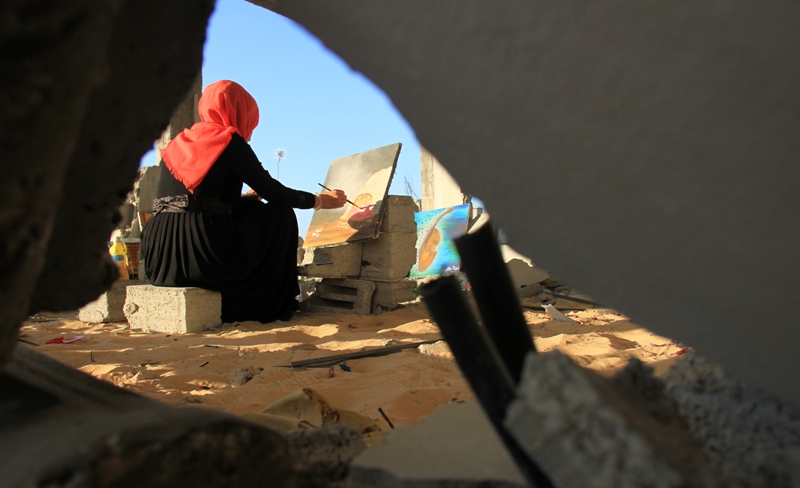 واستلهمت "آية" التي تدرس تربية فنية في جامعة الأقصى "مستوى ثانِ" جمال لوحاتها، من واقعها المؤلم الذي عاشته، وركام منزلها المُدمر، فلم تكتف برسم بالركام والوجع والألم، فخطت بريشتها منزلها عندما كان جميلاً محاطًا بالأشجار، وحالة الفرح بداخله قبل أن يتعرض للتدمير، في رسالة منها بالتحدي والصمود والإصرار للعودة للحياة بشكل أقوى.