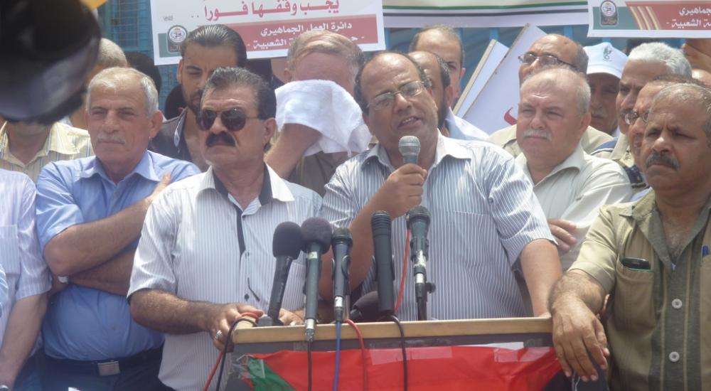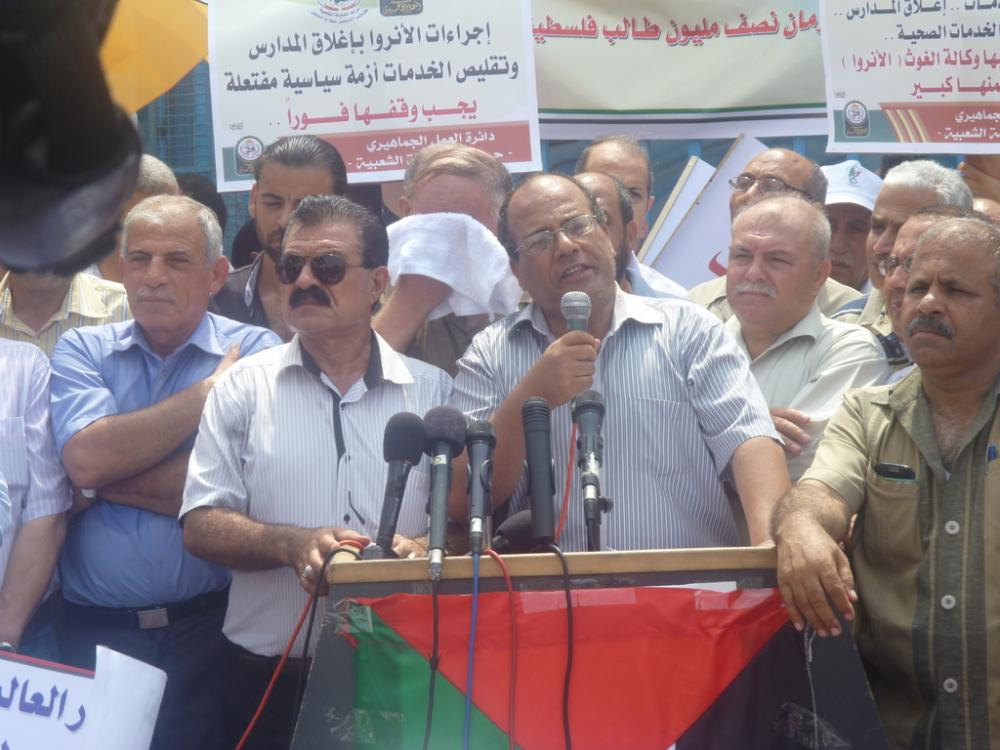 وقال عضو المكتب السياسي لحزب فدا عامر الجعب في كلمة ممثلة عن فصائل القوى الوطنية والإسلامية: "جئنا اليوم تعبيراً عن احتجاجنا ورفضنا القاطع ضد سلسلة الإجراءات التي تقوم بها الوكالة تحت ذرائع واهية عبر إلغاء بعض برامجها وتقليص بعضها الآخر".