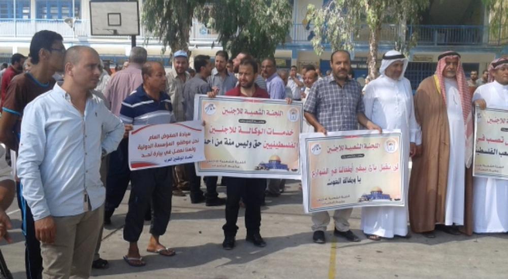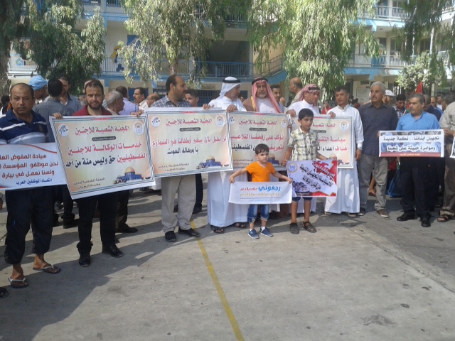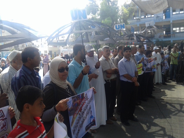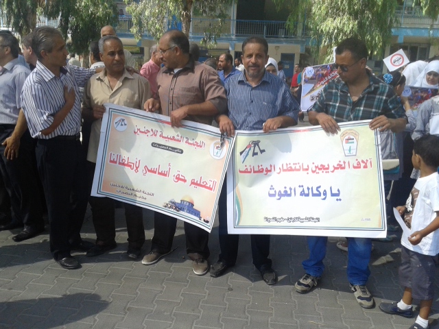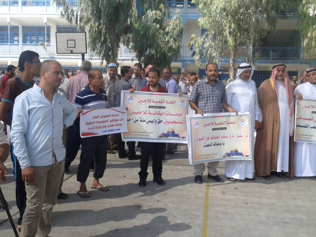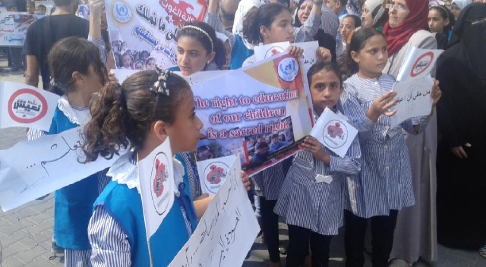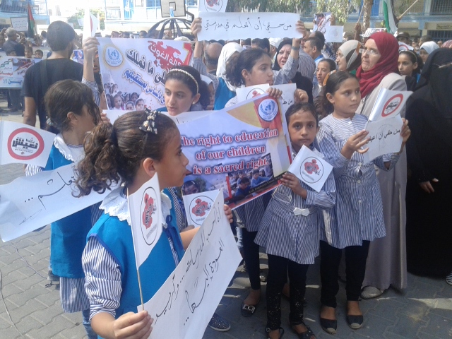 وتشارك الطالبة مي ولفيف من زملائها في وقفة احتجاجية دعا إليها اتحاد الموظفين العرب بمشاركة القوى الوطنية والإسلامية ونقابة العاملين وأولياء الأمور واللجان الشعبية للاجئين في المحافظة الوسطى.
