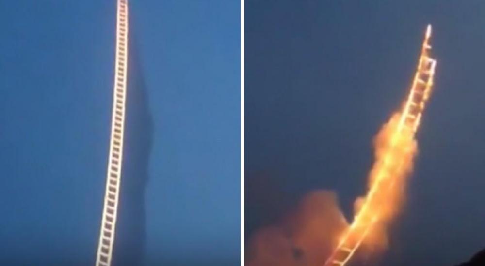 قدم الفنان الصيني تساي غوكيانغ سلمًا صاعدًا من الأرض إلى السماء، من الألعاب النارية، وسط عتمة الليل في مدينة تشيوانتشو الصينية.