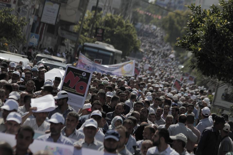 وقال رئيس الاتحاد سهيل الهندي في كلمة له إن هذه المسيرة الحاشدة التي يخرج فيها الموظفون لنصرة قضيتهم رسالة سخط وغضب على قرارات المفوض الخطيرة التي تهدف لمنح الموظف إجازة دون راتب، وأيضا برفع عدد الطلبة في الصف الواحد لخمسين طالبًا.