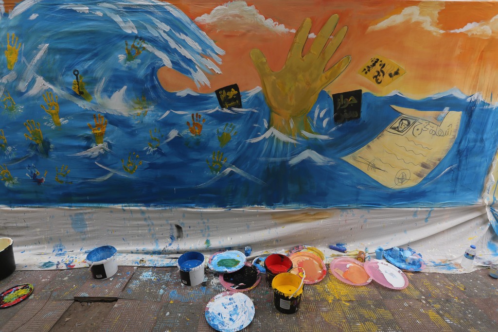 وليس ببعيد عن هذه الجدارية، اجتمعت 6 فتيات من محافظة رفح لرسم لوحة فنية أخرى تظهر فيها أيدي غارقة وسط البحر وبعض الوثائق والشهادات العلمية لشبان فلسطينيين هاجروا وطنهم بحثاً عن الحياة.