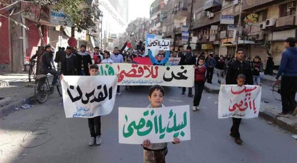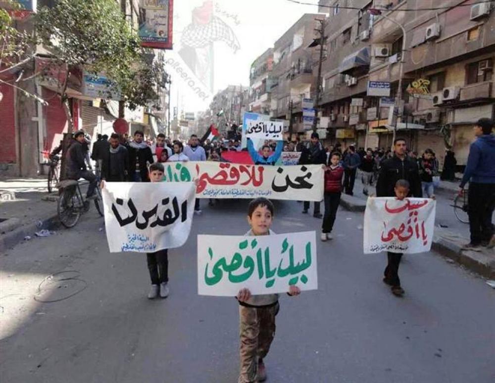 تظاهر أهالي مخيم اليرموك للاجئين الفلسطينيين المحاصر مساء الثلاثاء، في مسيرة تضامنية مع المسجد الأقصى المبارك، الذي يتعرض لعدوان إسرائيلي منذ 3 أيام.