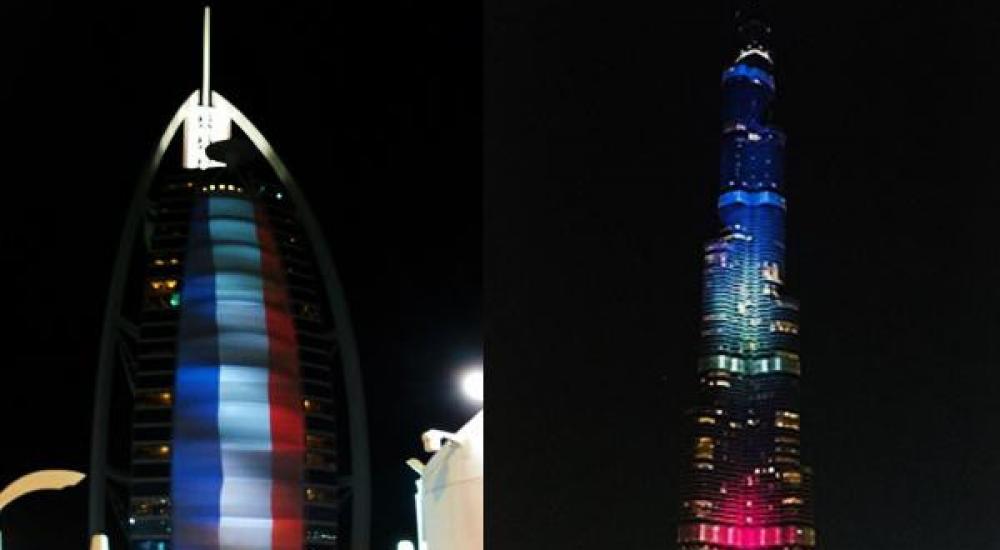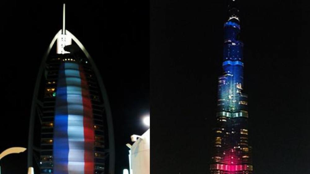 كما أضيء فندق "برج العرب" الشهير في دبي وفندق "قصر الإمارات" الفاخر جدا في أبوظبي بألوان العلم الفرنسي الأزرق والأبيض والأحمر تضامنا مع فرنسا.