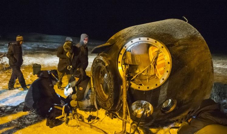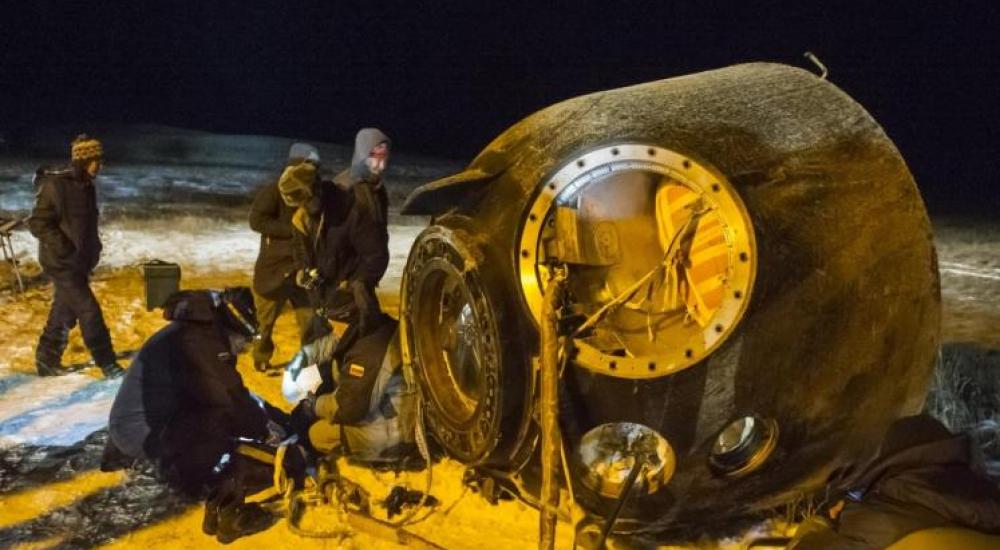 وهبطت المركبة الفضائية سويوز مظليا شمال شرق زيزكاجان في كزاخستان.
