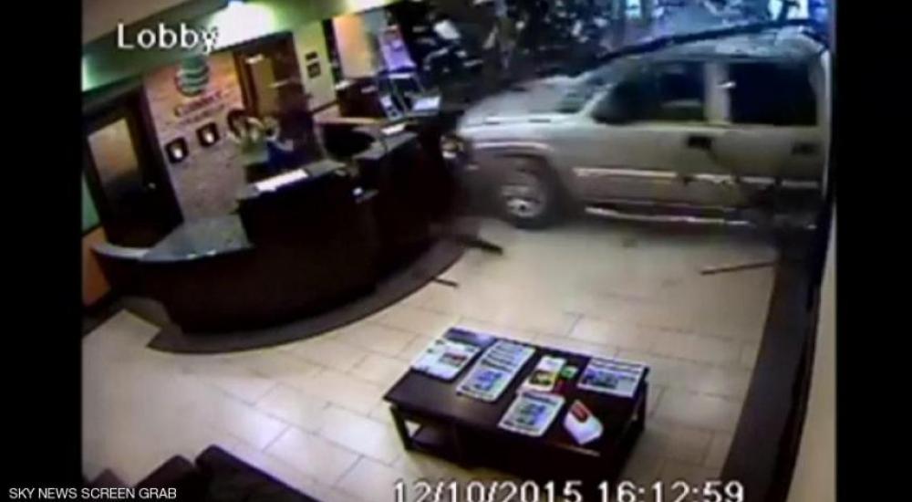 والتقطت كاميرات أخرى مثبتة في الفندق الشاحنة الصغيرة وهي تصطدم بمكتب الاستقبال، حيث نجح موظفان في الفرار دون أن يتعرضا لإصابات.
