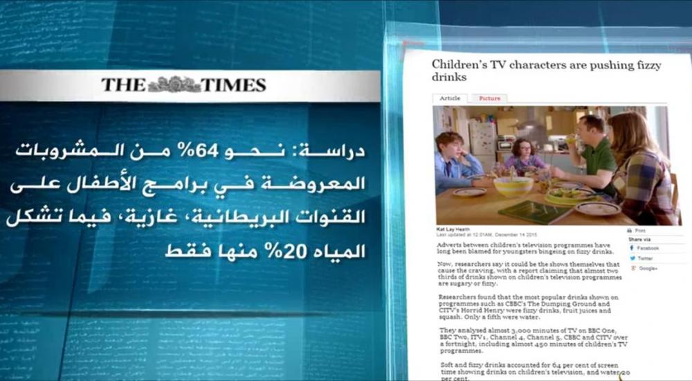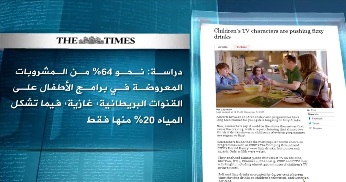 وقالت الصحيفة إن الدراسة وجدت أن نحو 64% من المشروبات المعروضة في برامج الأطفال على القنوات البريطانية غازية، بينما تشكل المياه -التي يعد شربها خيارا صحيا- 20% فقط.