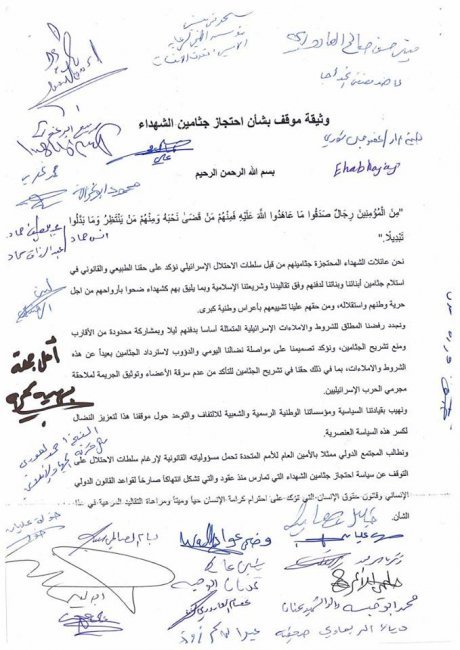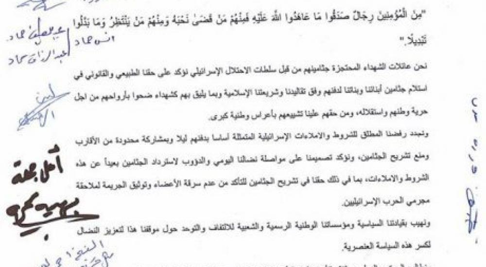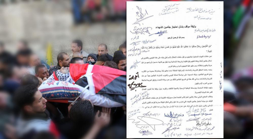 يأتي ذلك فيما وقع أهالي الشهداء المحتجزة جثامينهم على وثيقة تتضمن رفضهم شروط الاحتلال بشأن تسليم جثامين أبنائهم، مؤكدين أنهم لن يدفنوا أبنائهم من دون تشريح جثامينهم.